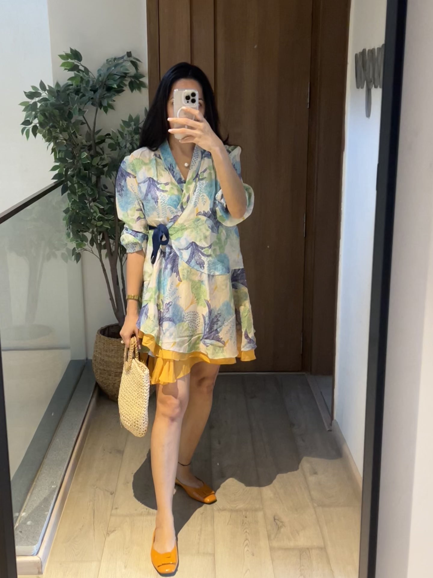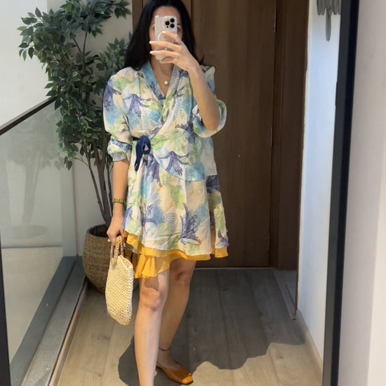 Step into chic elegance with this playful wrap-style mini dress, designed to flatter with its effortless silhouette. Featuring a delicate pastel floral print, the dress is cinched at the waist with a contrast tie-up belt, adding shape and sophistication. The standout detail is its vibrant mustard-yellow hem, creating a striking layered effect for a modern twist.