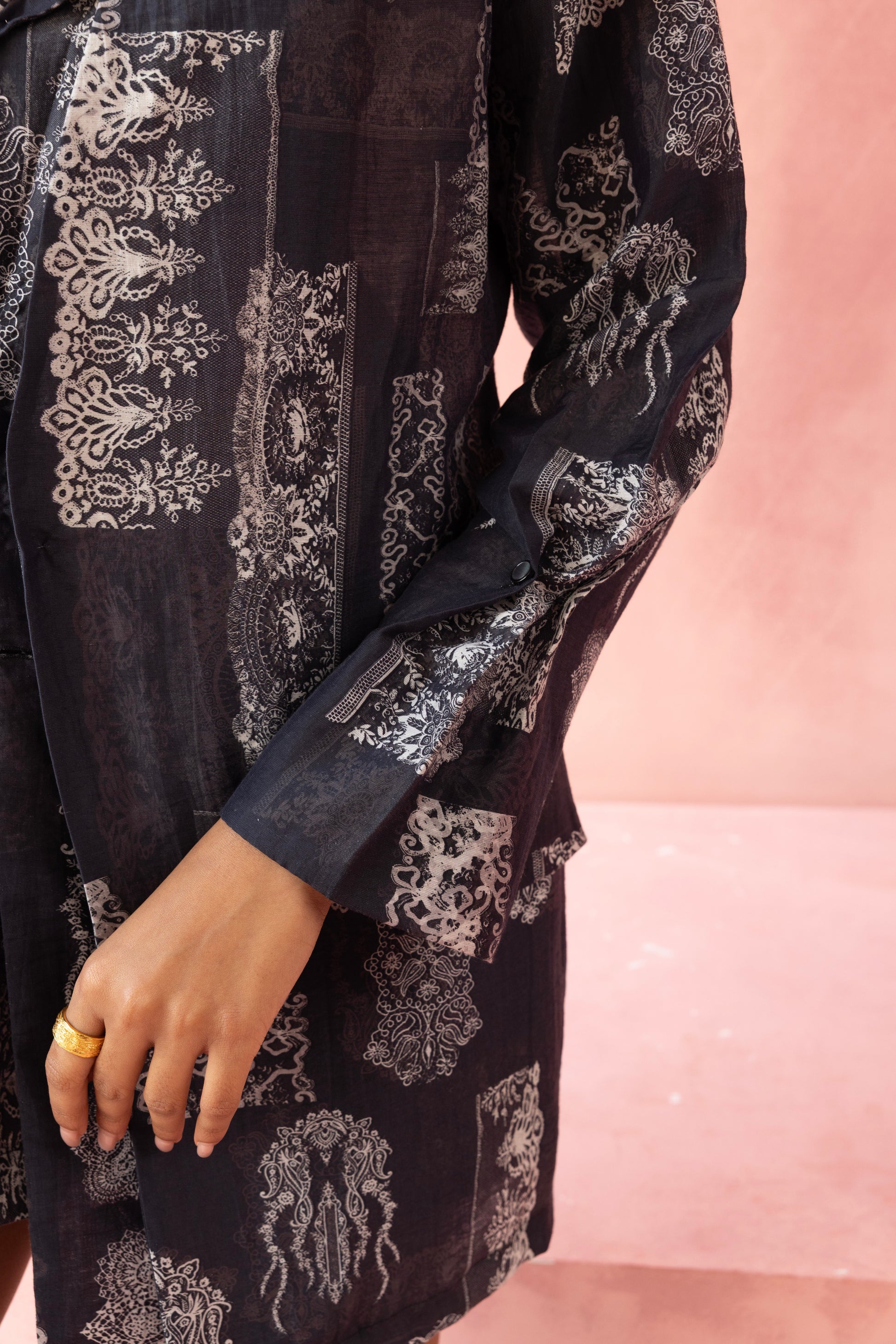 Sharp yet summer-ready, this blazer and shorts set redefines warm-weather tailoring. Crafted in a lightweight fabric, the relaxed blazer features a classic lapel and buttoned front, elevated with an intricate monochrome print that adds depth and character. Paired with matching tailored shorts, the set balances structure with ease for a confident, modern look.