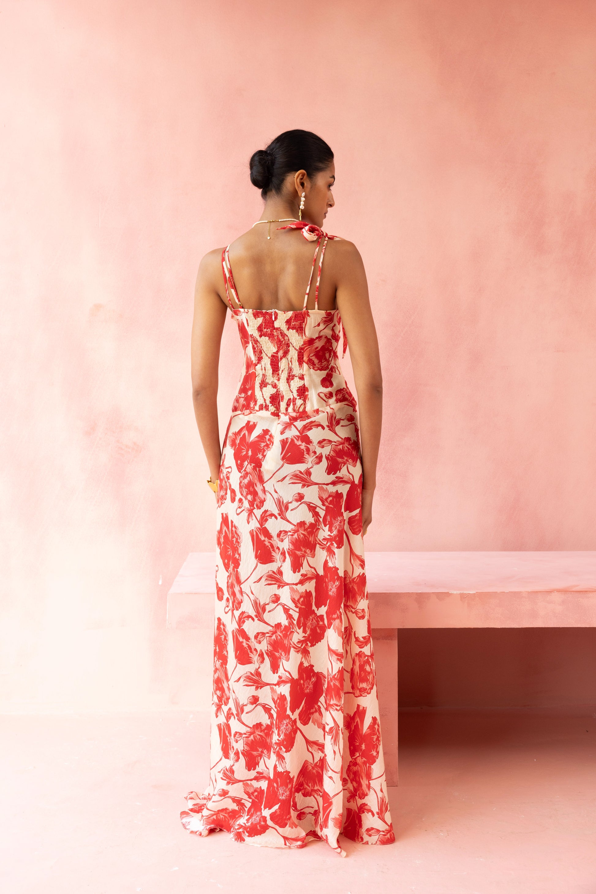 Bold, romantic, and made to move, this statement maxi dress captures the essence of summer glamour. Crafted in a lightweight, flowing fabric, it features a striking floral print that feels fresh yet timeless. The deep V-neckline with soft shoulder ties adds a feminine touch, while the gently ruched waist creates a flattering fit. Finished with a dramatic side slit and an effortless drape,
