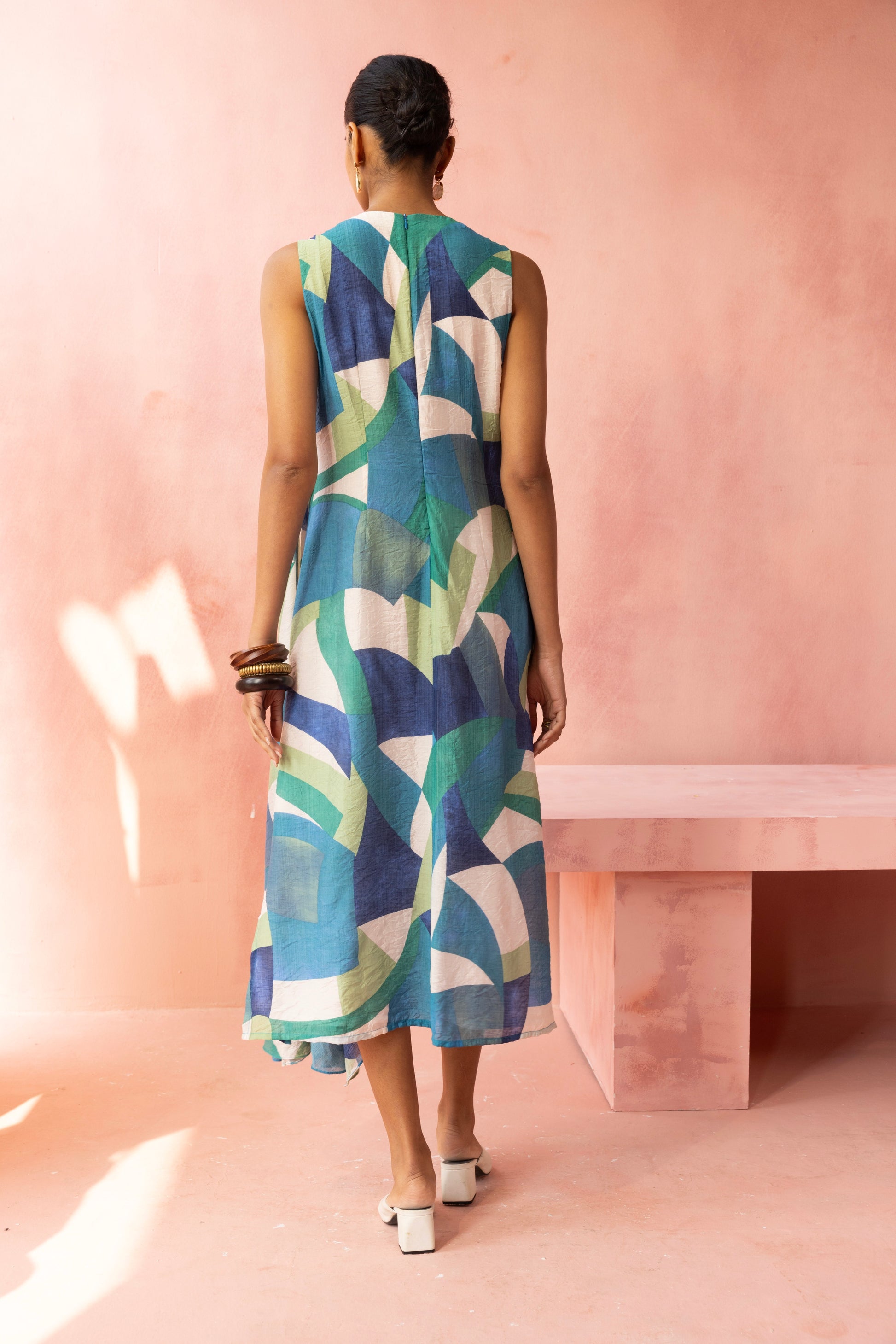 This sleeveless midi dress features a fluid, relaxed silhouette brought to life with an abstract geometric print in calming blue and green tones. Designed with a deep V neckline and accented by a distinctive ring detail with beaded embellishment at the waist, it creates gentle definition while maintaining effortless movement.
