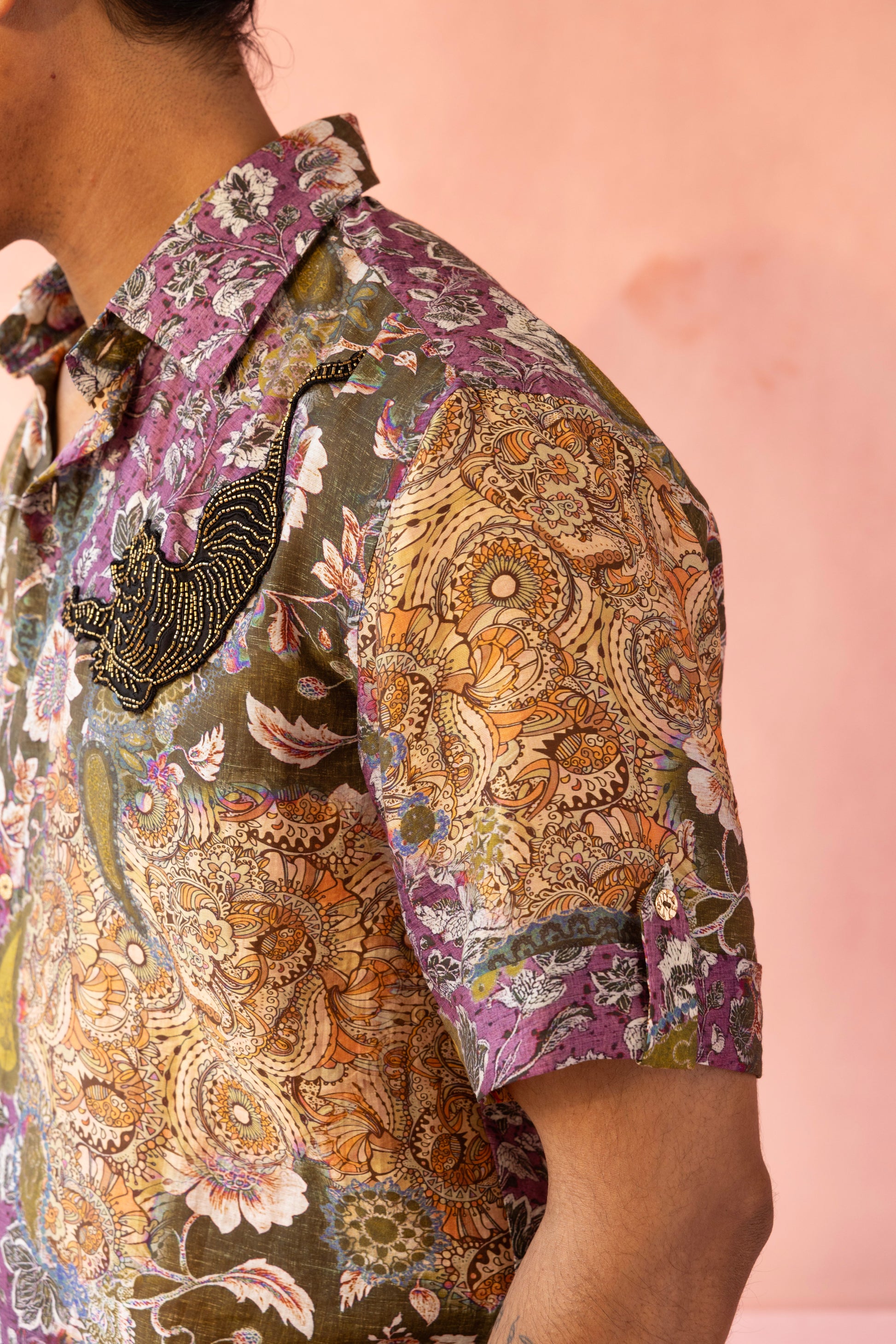 Crafted from lightweight, breathable fabric, this men’s printed shirt features a rich patchwork of delicate floral motifs that evoke a vintage, artisanal charm; elevated with a hand-embroidered statement patch on the chest, it adds a distinctive handcrafted detail to the design, while the relaxed fit, soft collar, and refined button-down front ensure all-day comfort