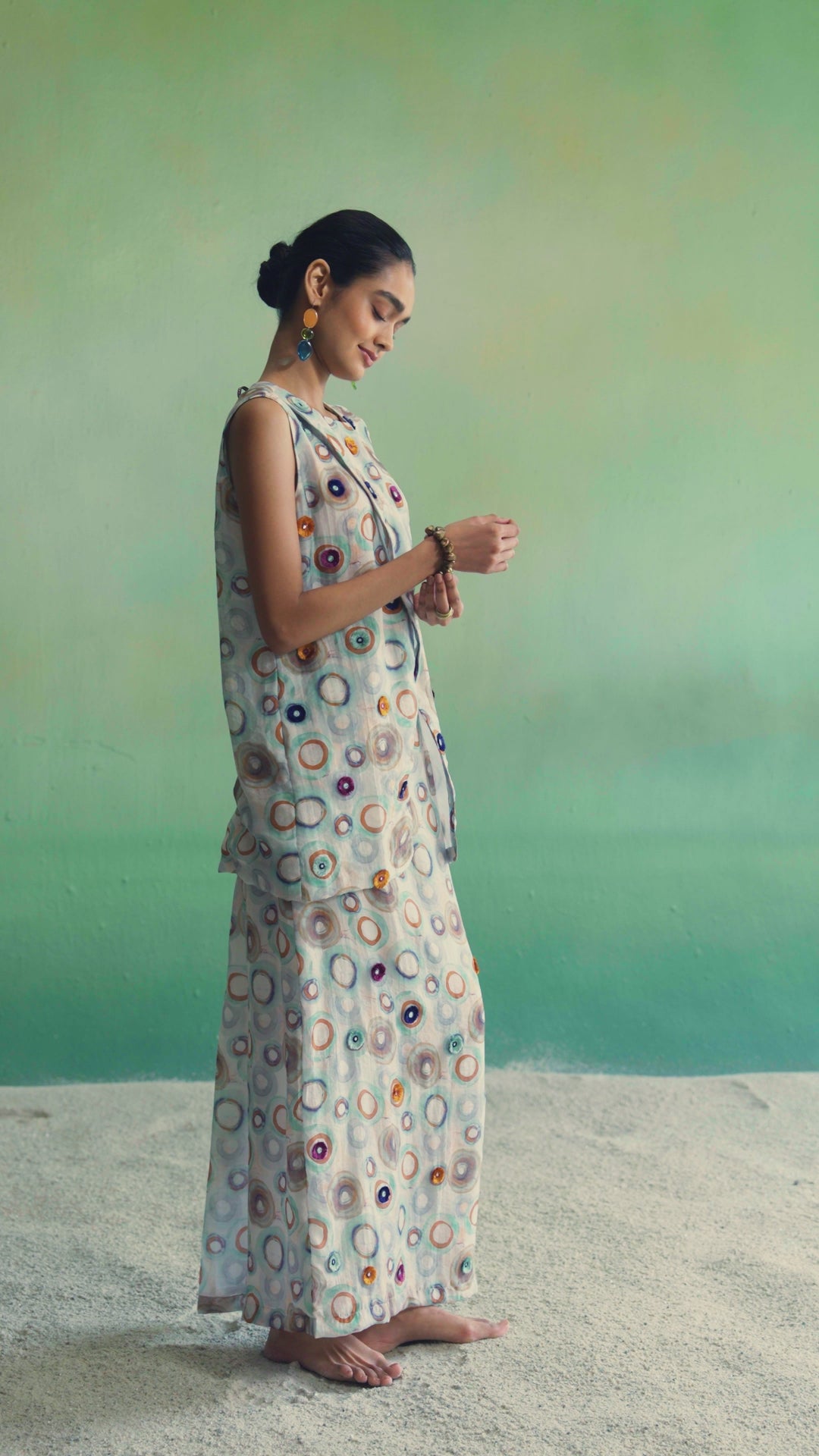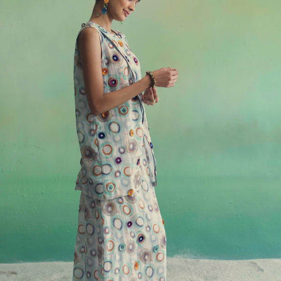 A graceful top and skirt set crafted in a soft, flowy fabric, highlighted with delicate thread embroidery and mirror work within the circular motifs. The relaxed silhouette offers effortless movement while keeping the look refined and elegant. Perfect for festive days, summer gatherings, and elevated daytime styling.