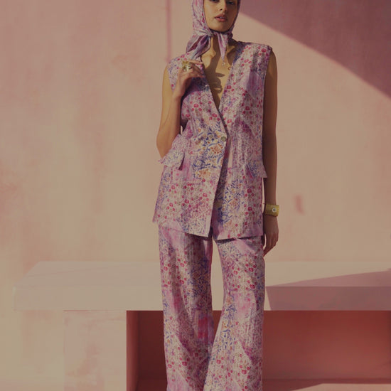This blazer and pant set blends effortless structure with soft elegance, featuring a sleeveless blazer with a deep V neckline and a refined patchwork-inspired print that adds subtle character. Designed for ease and versatility, the tailored blazer pairs seamlessly with relaxed straight-leg pants that drape fluidly for all-day comfort.