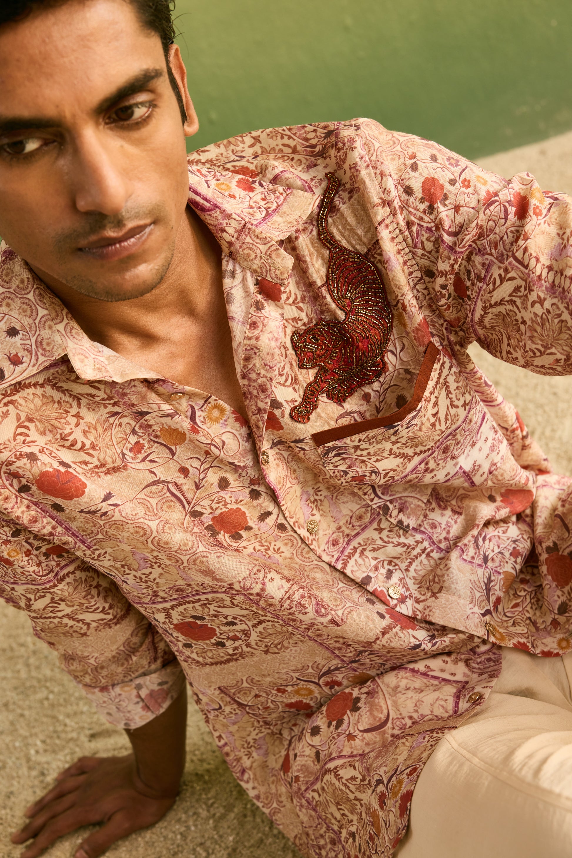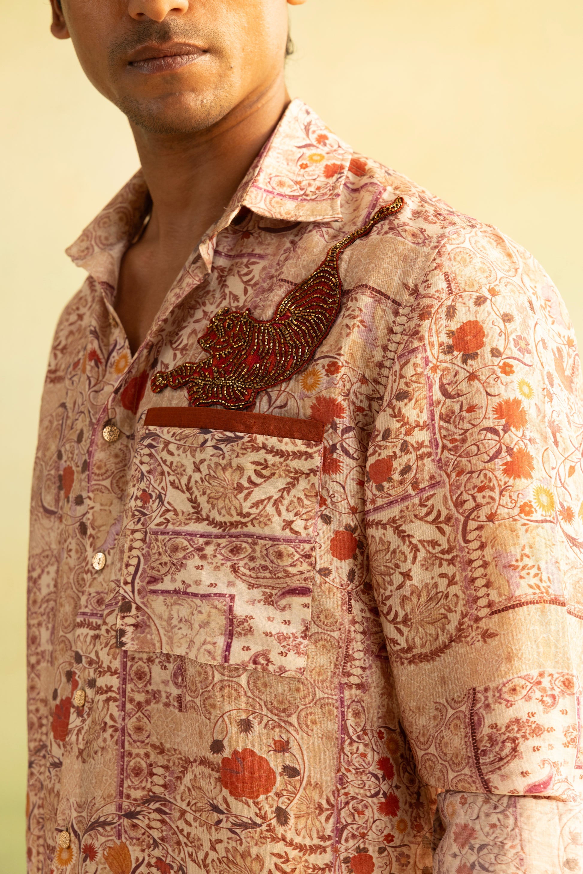 Crafted from lightweight, breathable fabric, this men’s printed shirt features an intricate all-over floral pattern that brings a soft, artisanal elegance to the design; elevated with a carefully hand-embroidered patch on the chest, it adds a distinctive handcrafted detail that sets the piece apart, while the relaxed fit, classic collar, and fluid drape ensure all-day comfort
