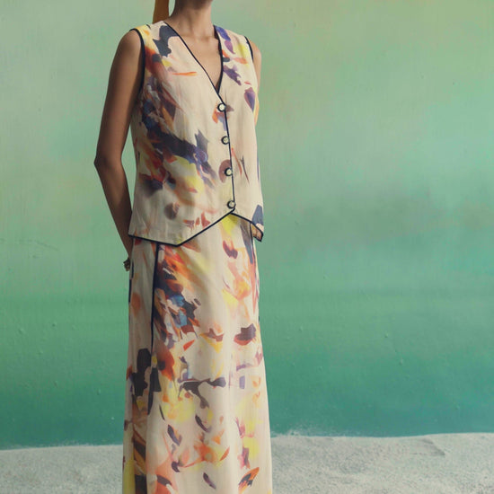 Effortlessly refined, this waistcoat and skirt set brings modern ease to summer dressing. Crafted in a lightweight fabric with a soft, painterly print, the sleeveless waistcoat features a clean V-neck, button-down front, and contrast piping for a sharp finish. Paired with a fluid, mid-length skirt that drapes beautifully, the set strikes the perfect balance between structure and movement.
