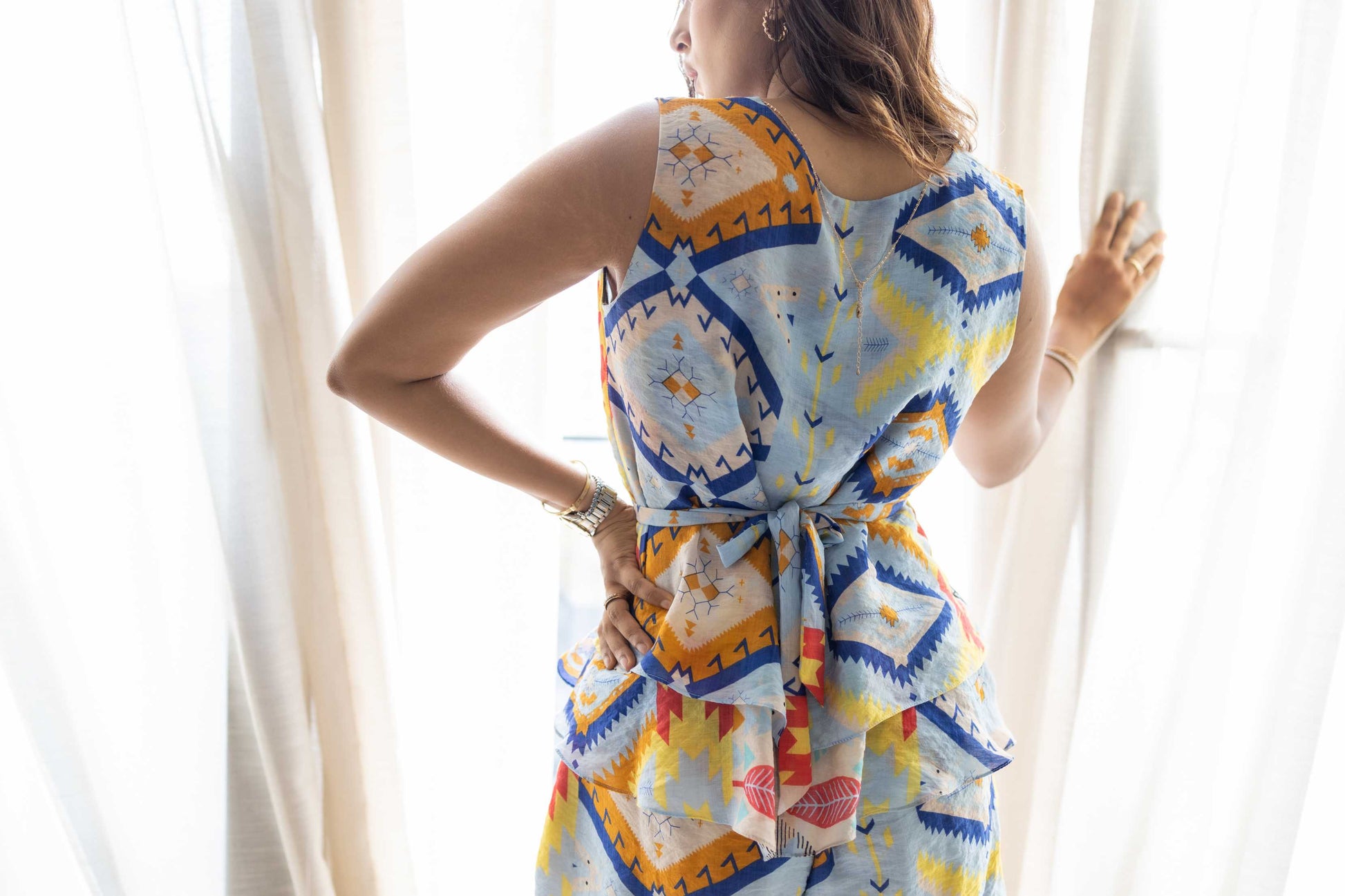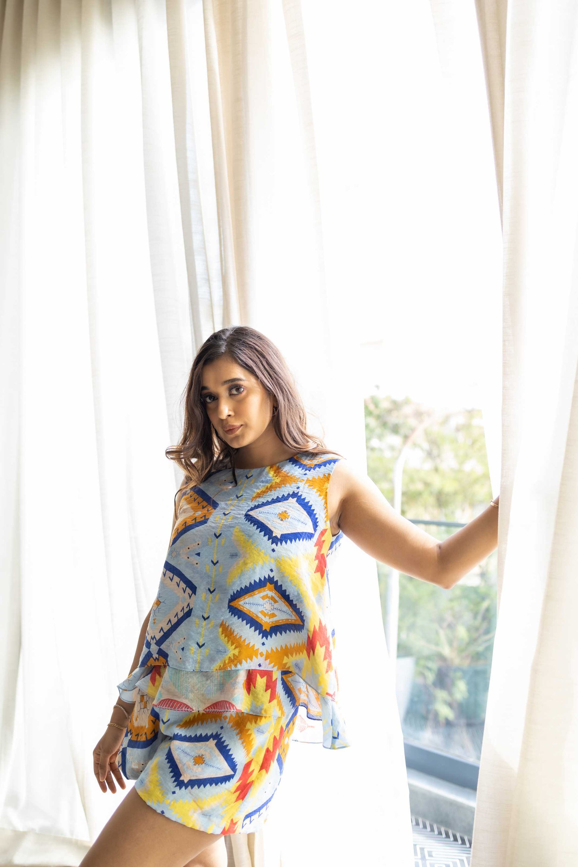 A colourful horizon with shorts in gradients of blue, orange, lime, and red.A colourful horizon double layered top with belt and elasticated shorts in gradients of blue, orange, lime & red with a coordinating belt highlights the waistline.