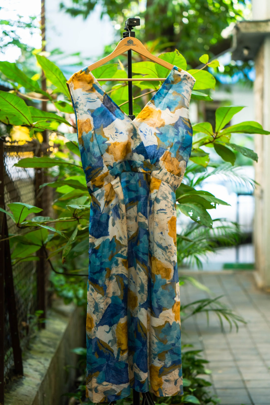 A dreamy blend of art and fashion, this sleeveless dress features a watercolor-inspired print in calming shades of blue, mustard, and ivory. Designed with a flattering V-neckline and a softly cinched waist, it creates an elegant silhouette while remaining effortlessly comfortable.