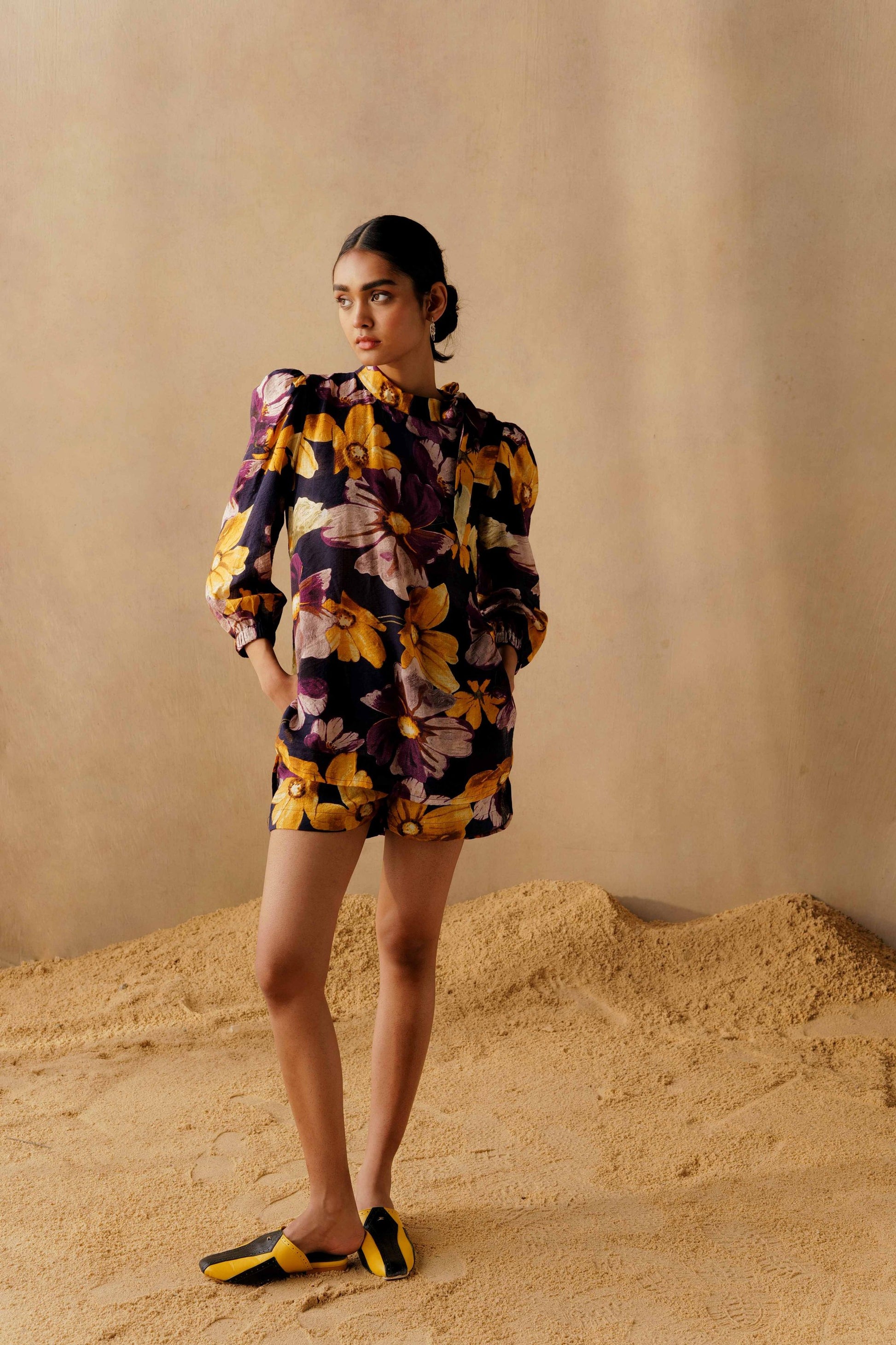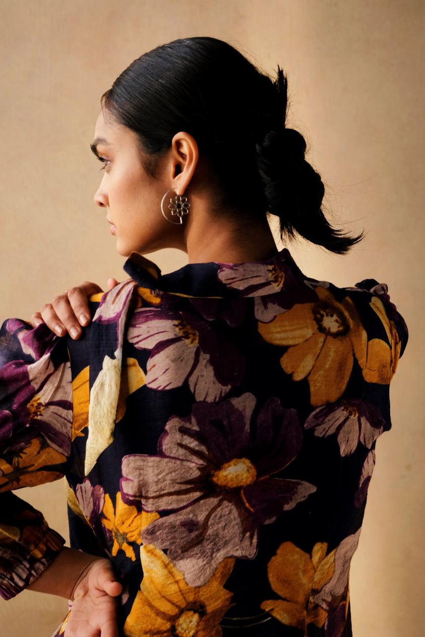 Wine and ochre flowers printed on midnight cotton and silk Blend take their inspiration from botanic gardens with countless styling possibilities.