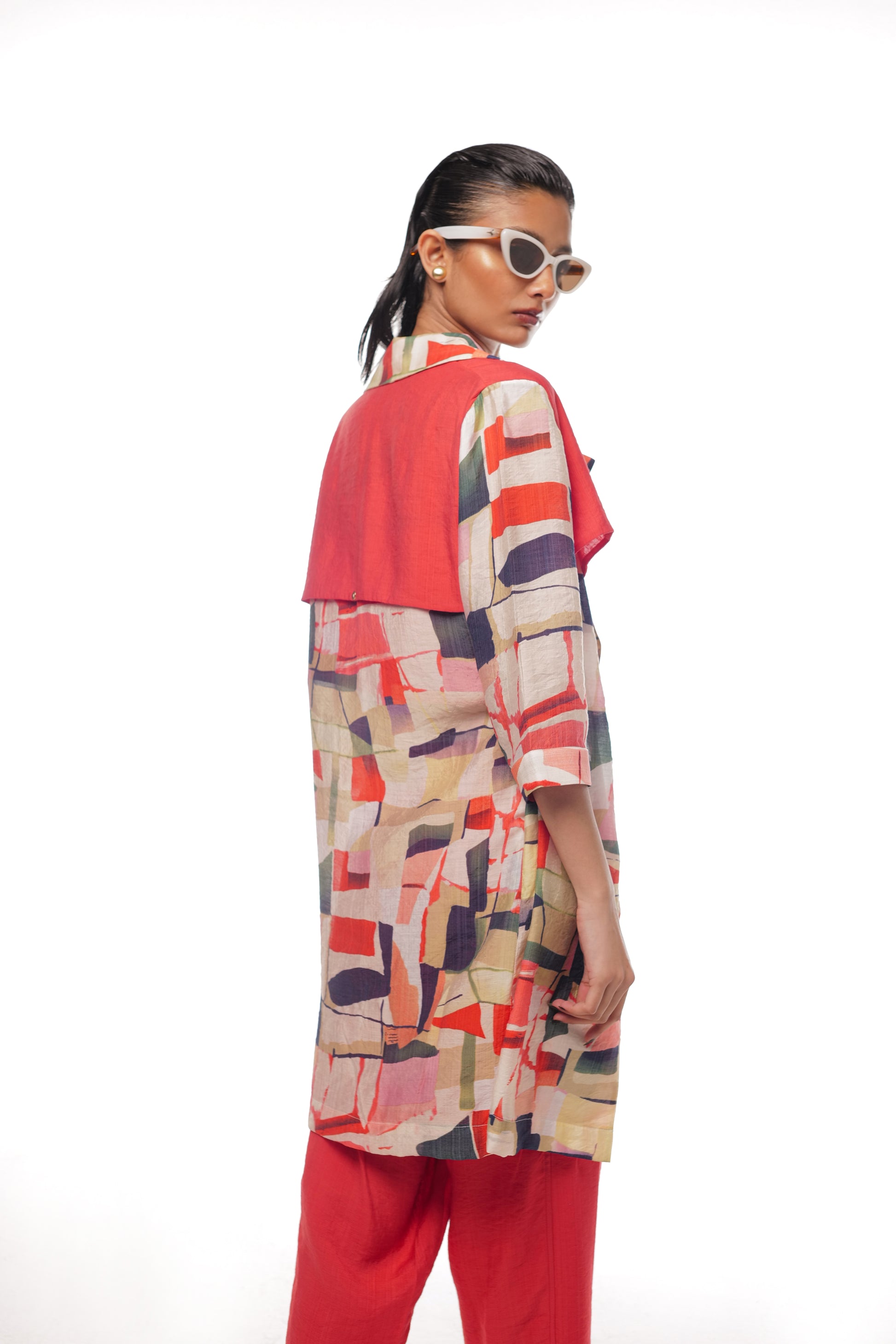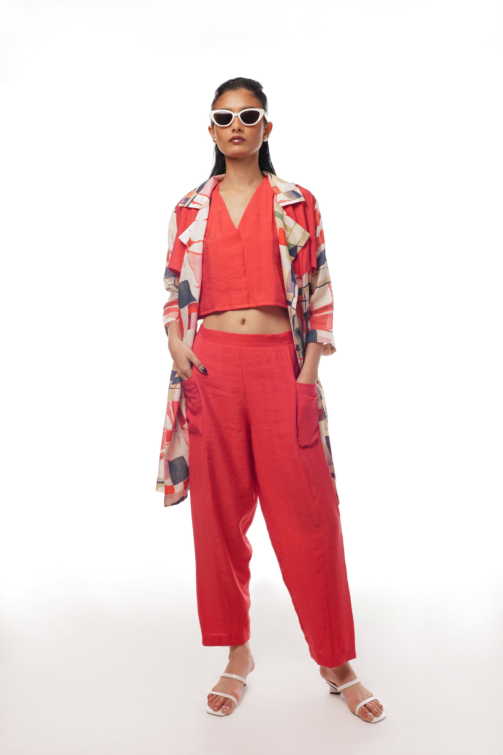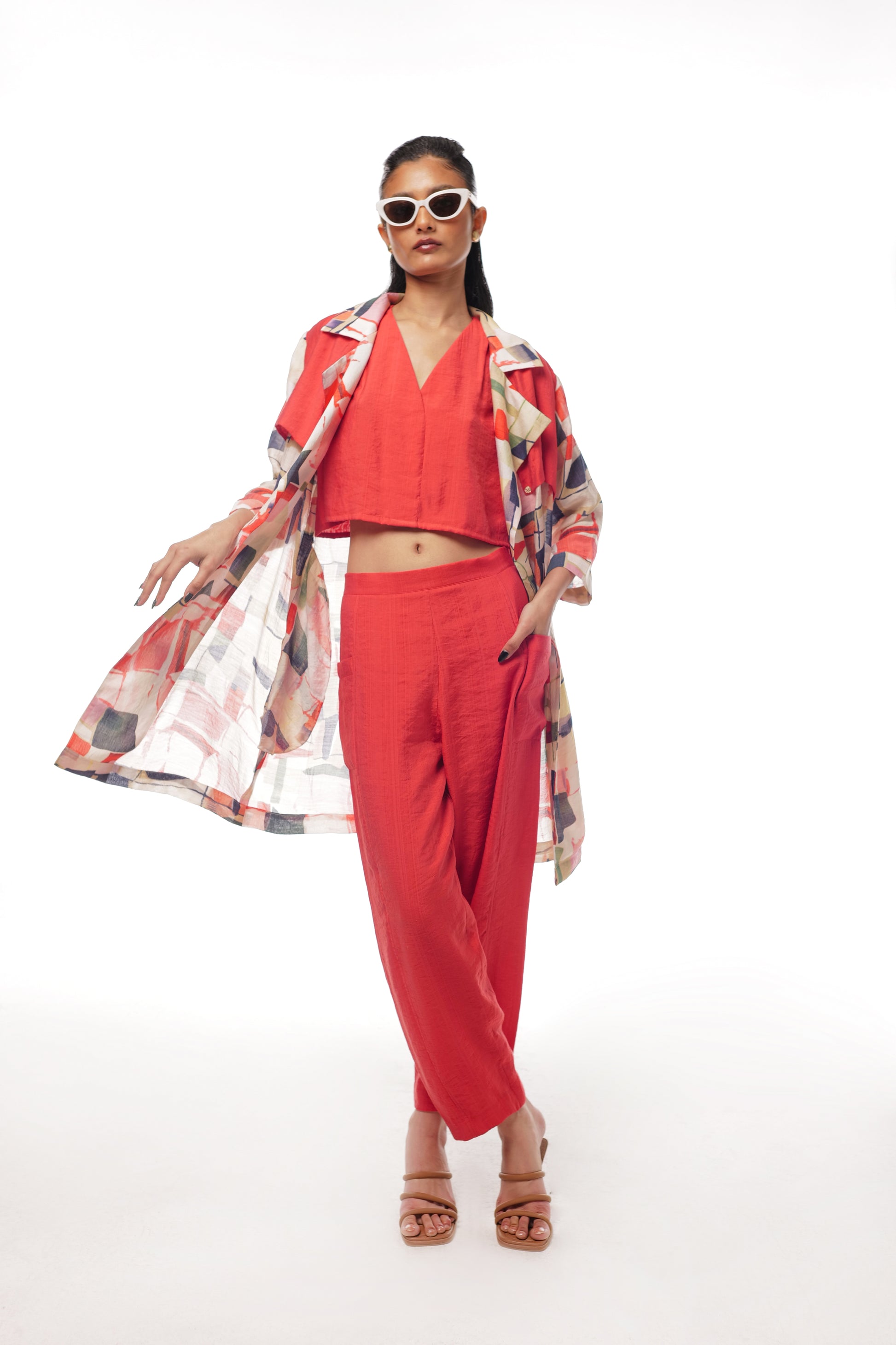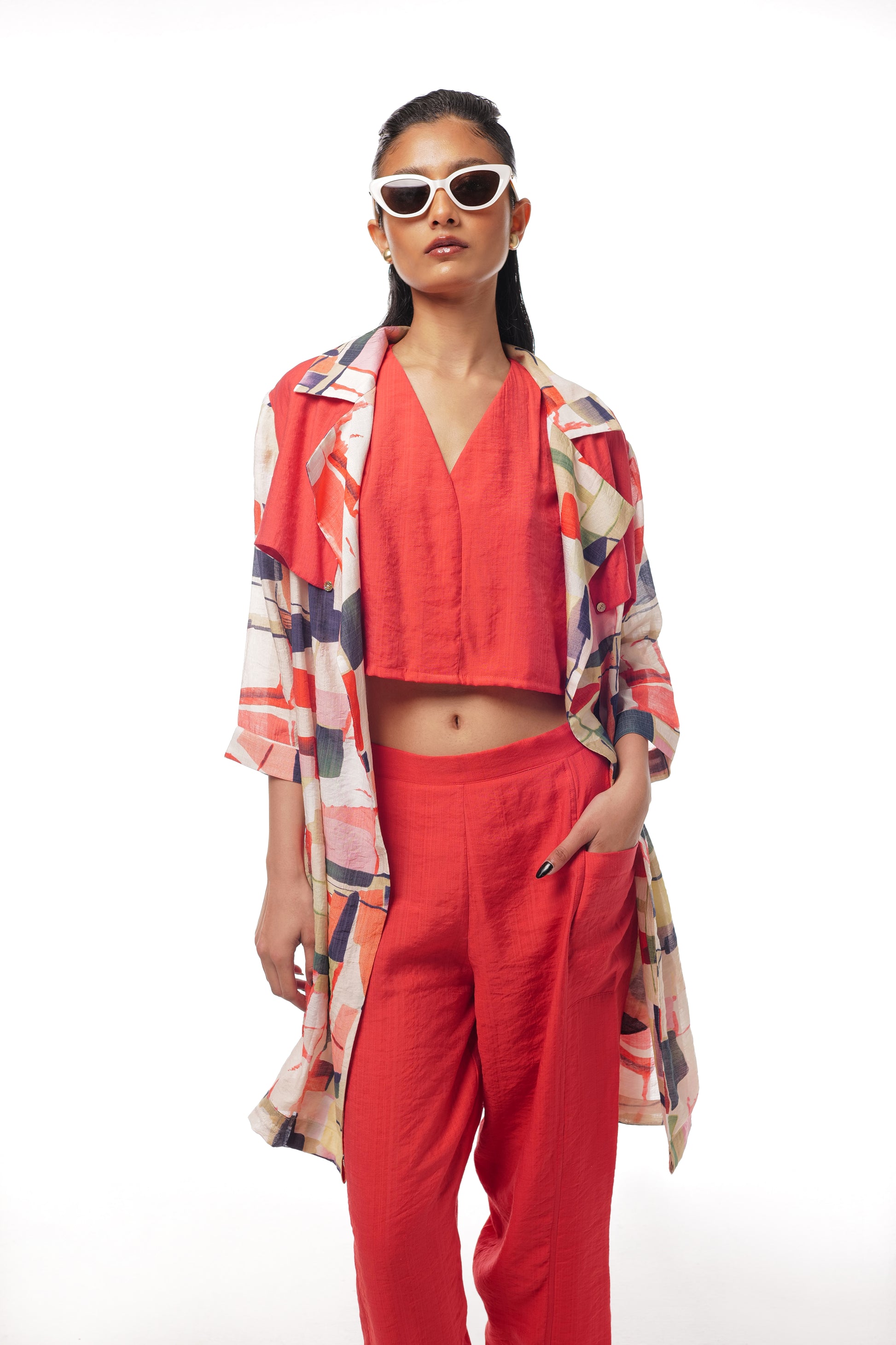Crimson set features a printed open jacket adorned with distinctive red flap detailings on the back and front, and pockets for added convenience. The jacket is paired with a vibrant red V-neck top and matching red Holly pants, creating a cohesive and stylish look. Perfect for turning heads, the Crimson 3-Piece Set seamlessly blends modern design with vibrant color, making it an essential addition to your wardrobe.