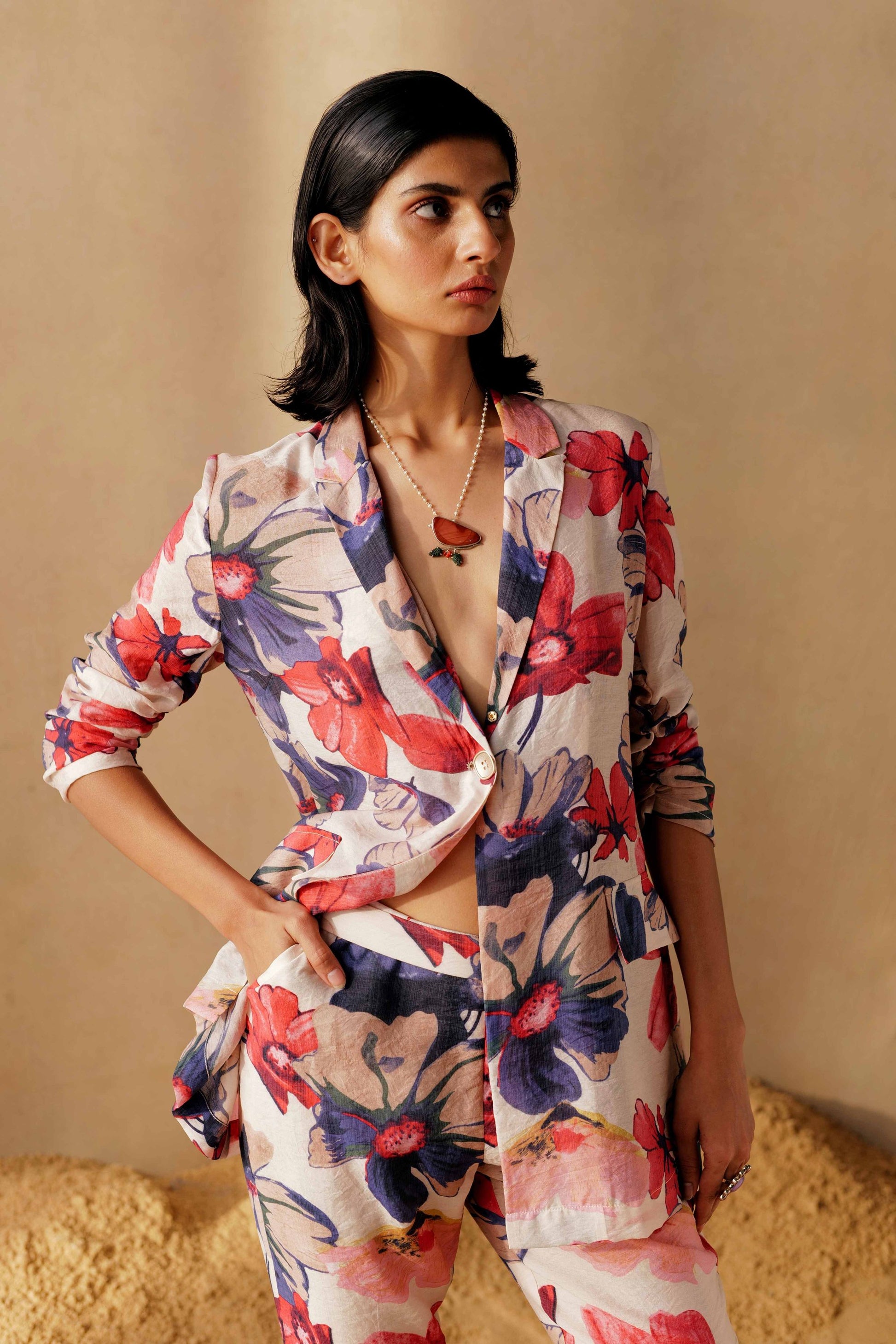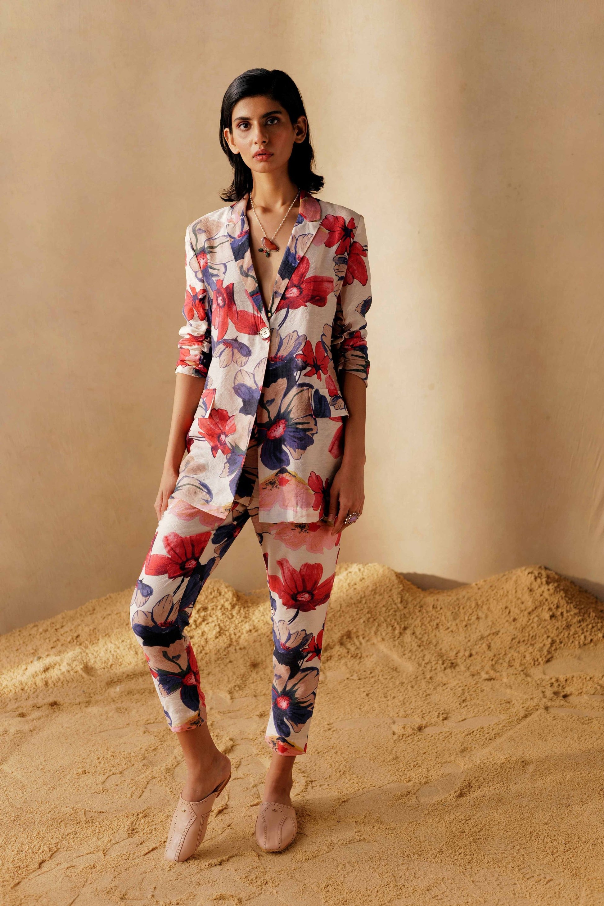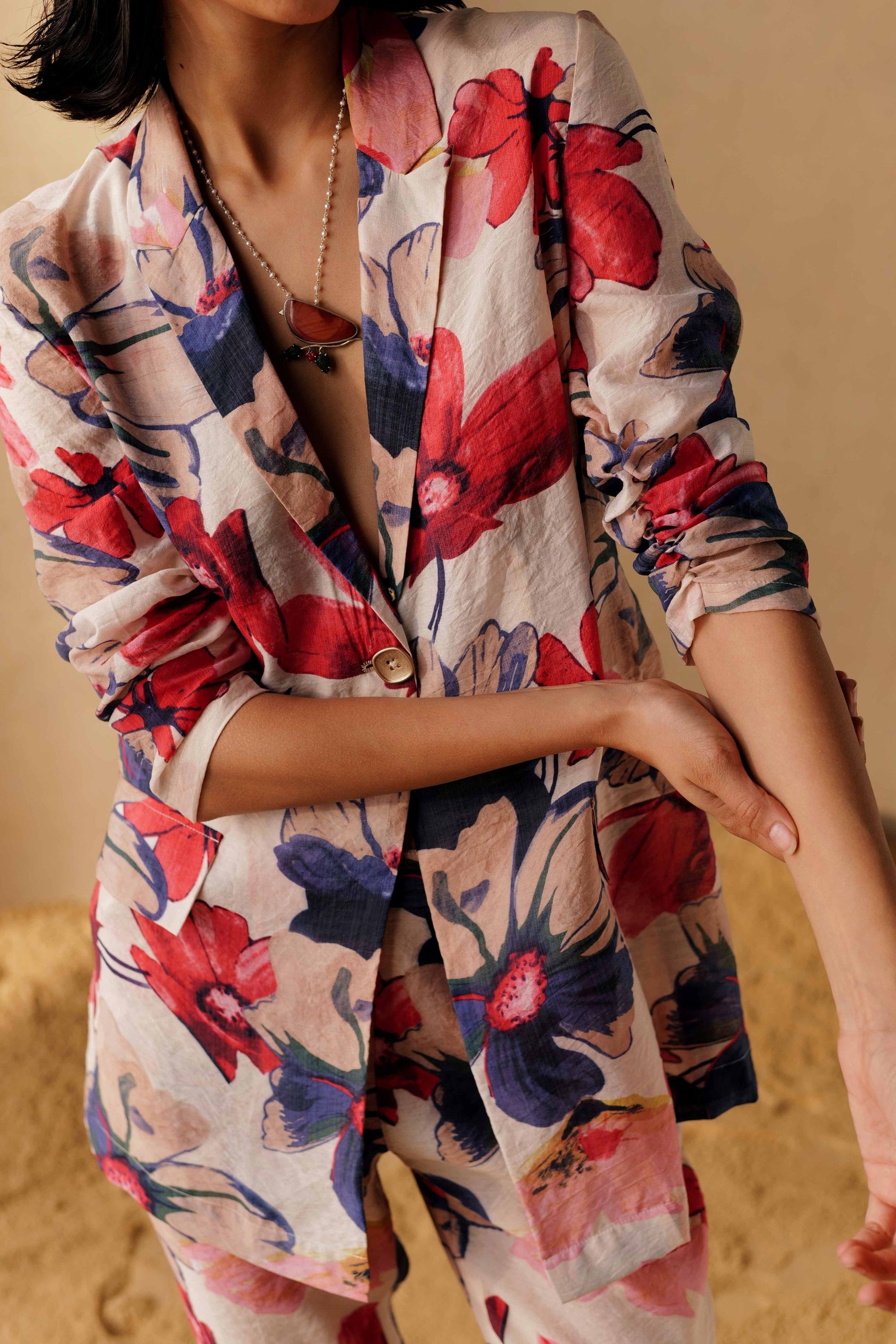 Crafted in ruby, Blue flowers on a Blend of cotton and silk this full bloom print lightweight blazer pant set is enriched by ruched sleeves with a golden button and elasticated belt pants.