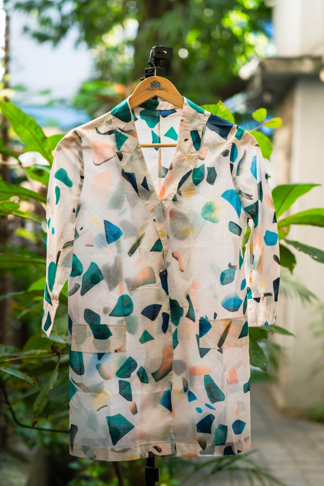 Effortlessly modern, this co-ord set pairs a longline, lightweight shirt with matching pants in a striking abstract print of teal, peach, and earthy tones. The shirt features a relaxed silhouette with a notch collar and pockets, while the coordinated pants offer easy comfort and versatility.