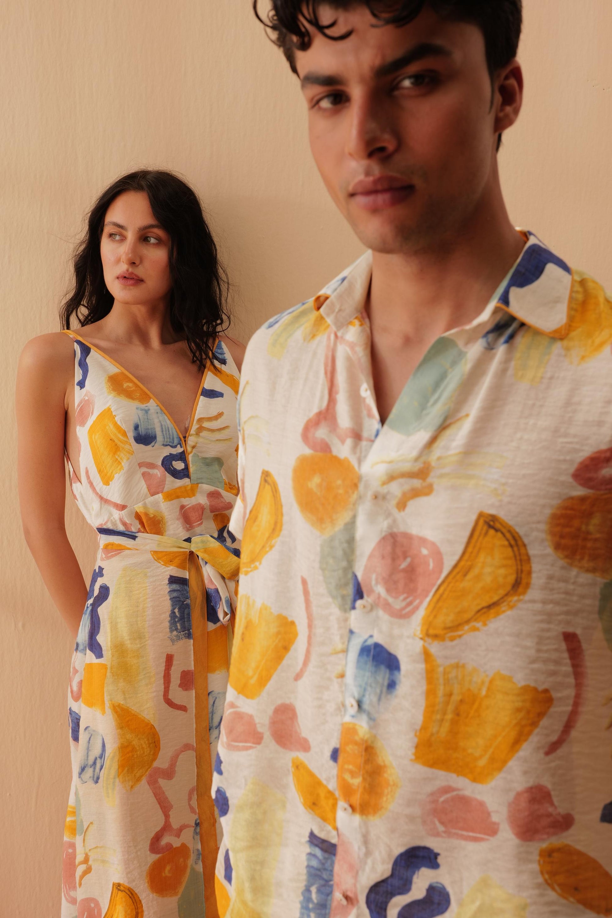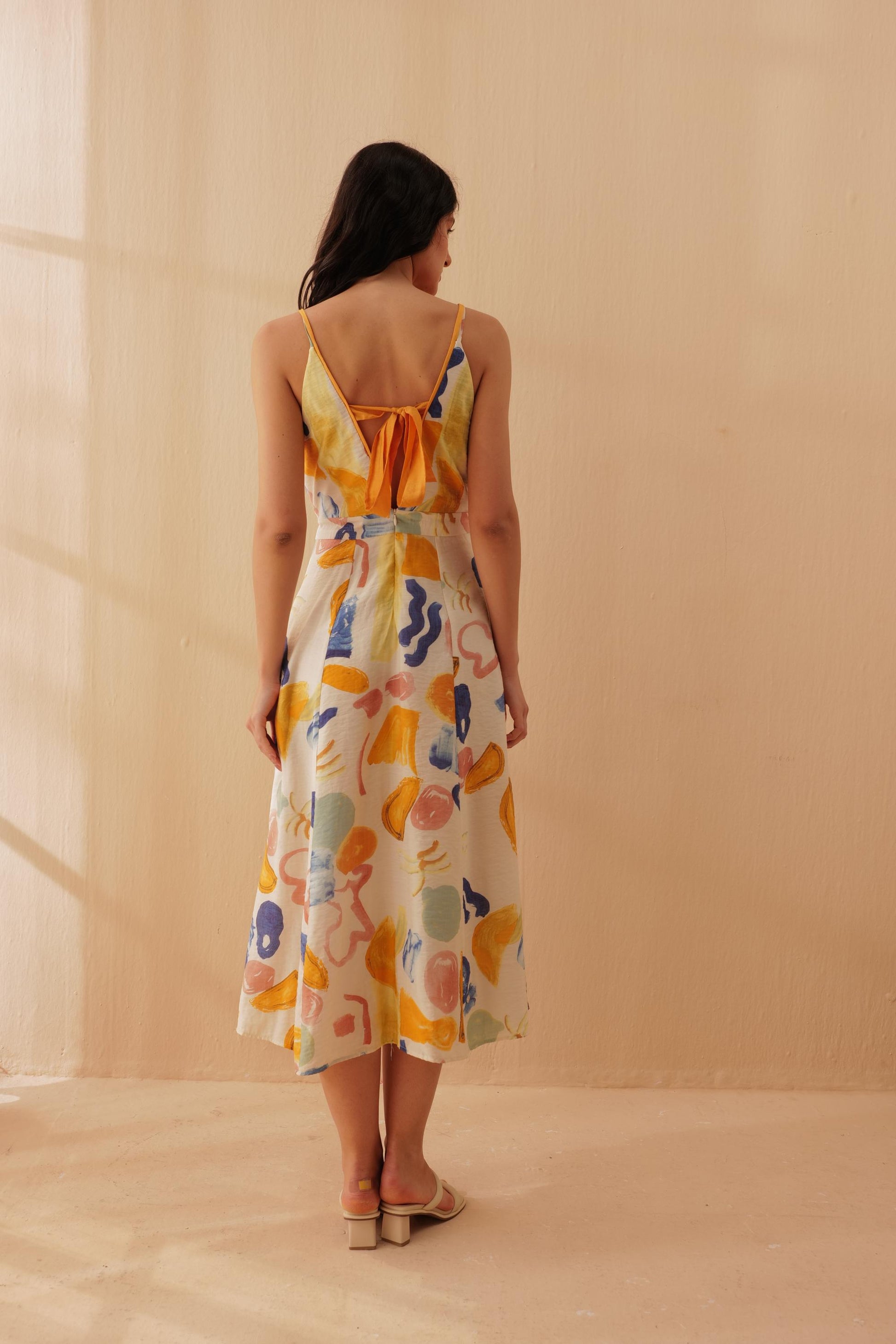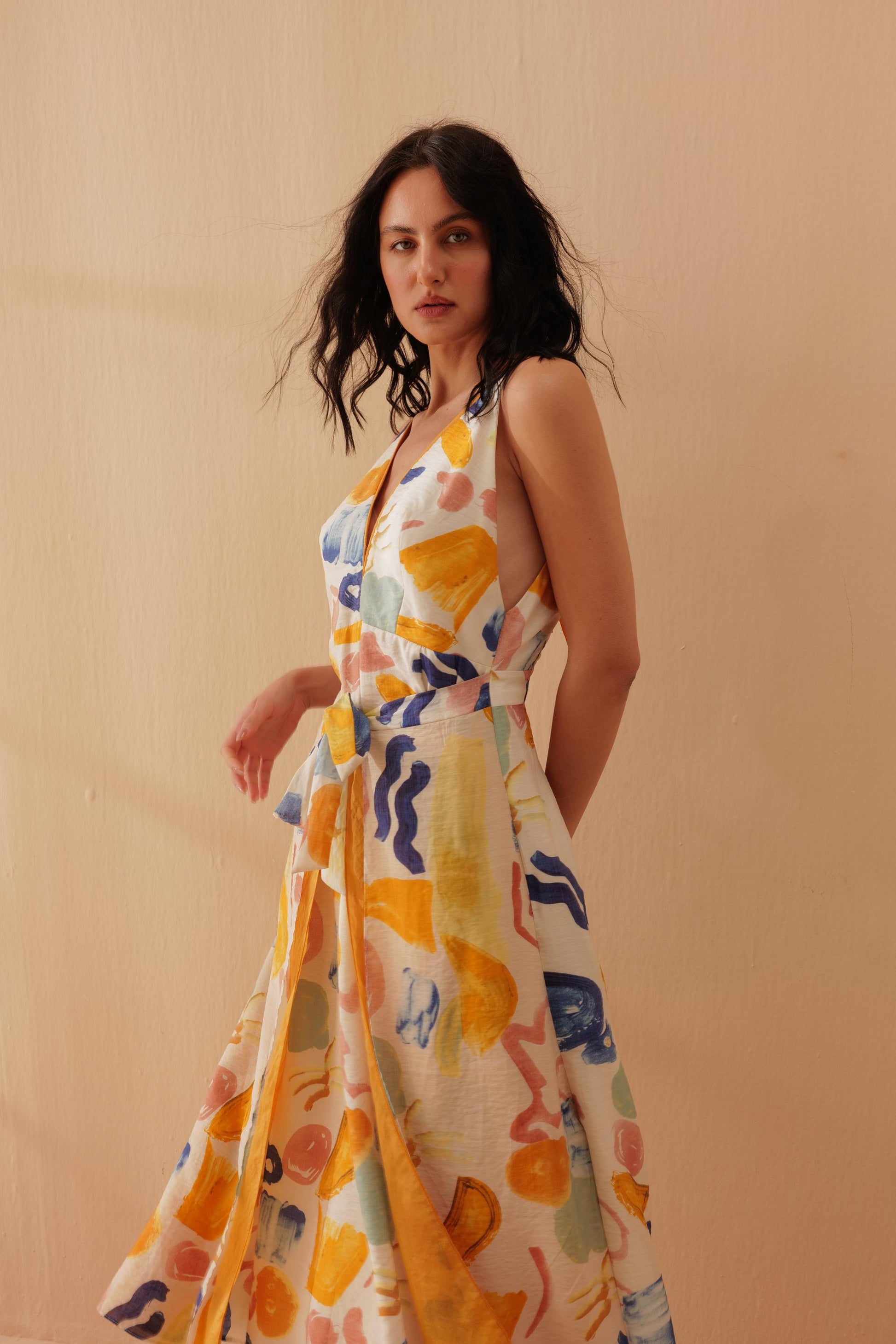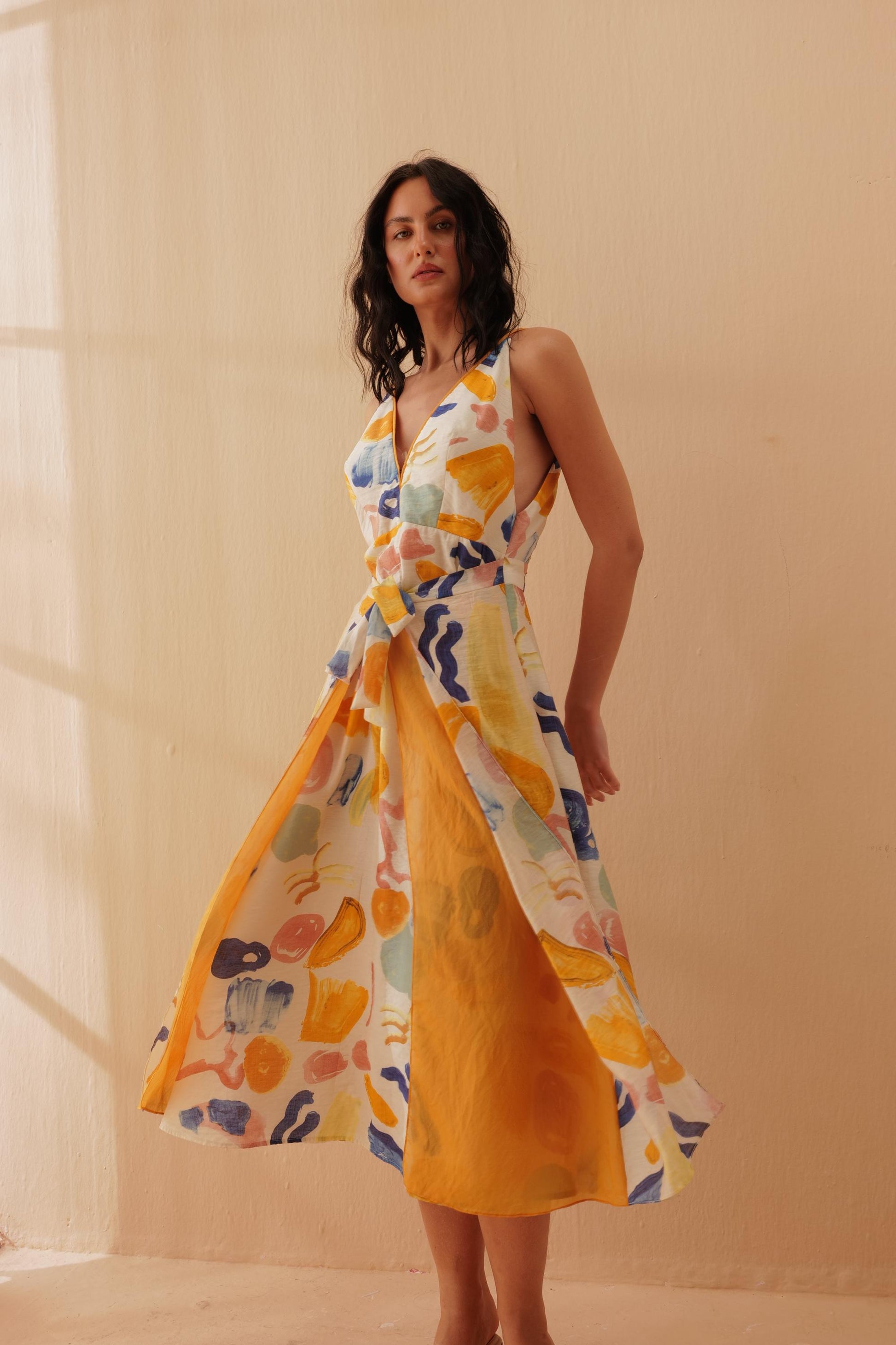 Lance print layered flap dress with one side slit,pockets and yellow detailing with back self tie up has cups, adjustable straps and back zip closure .