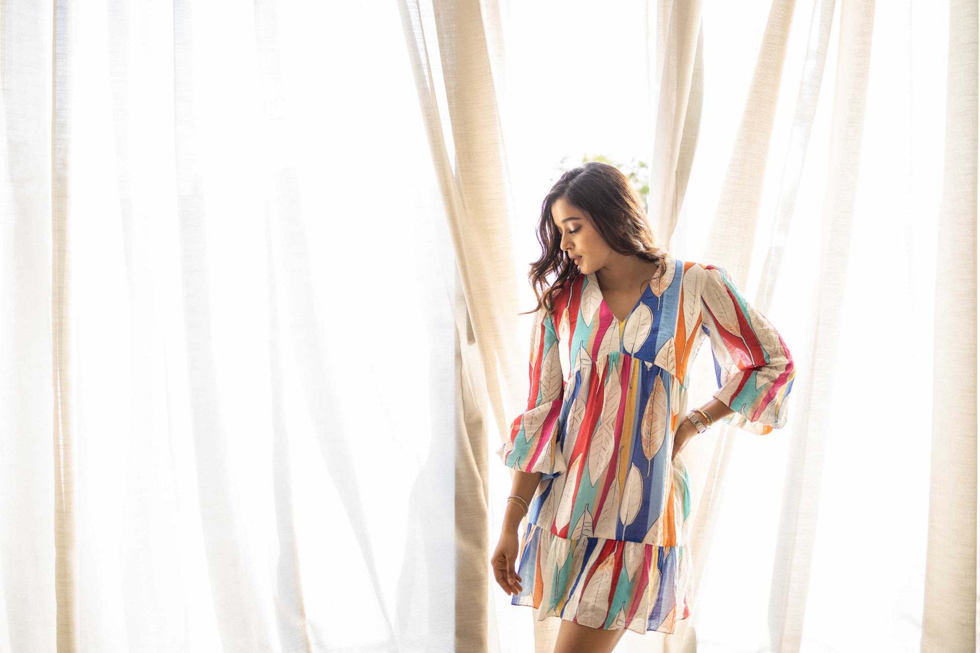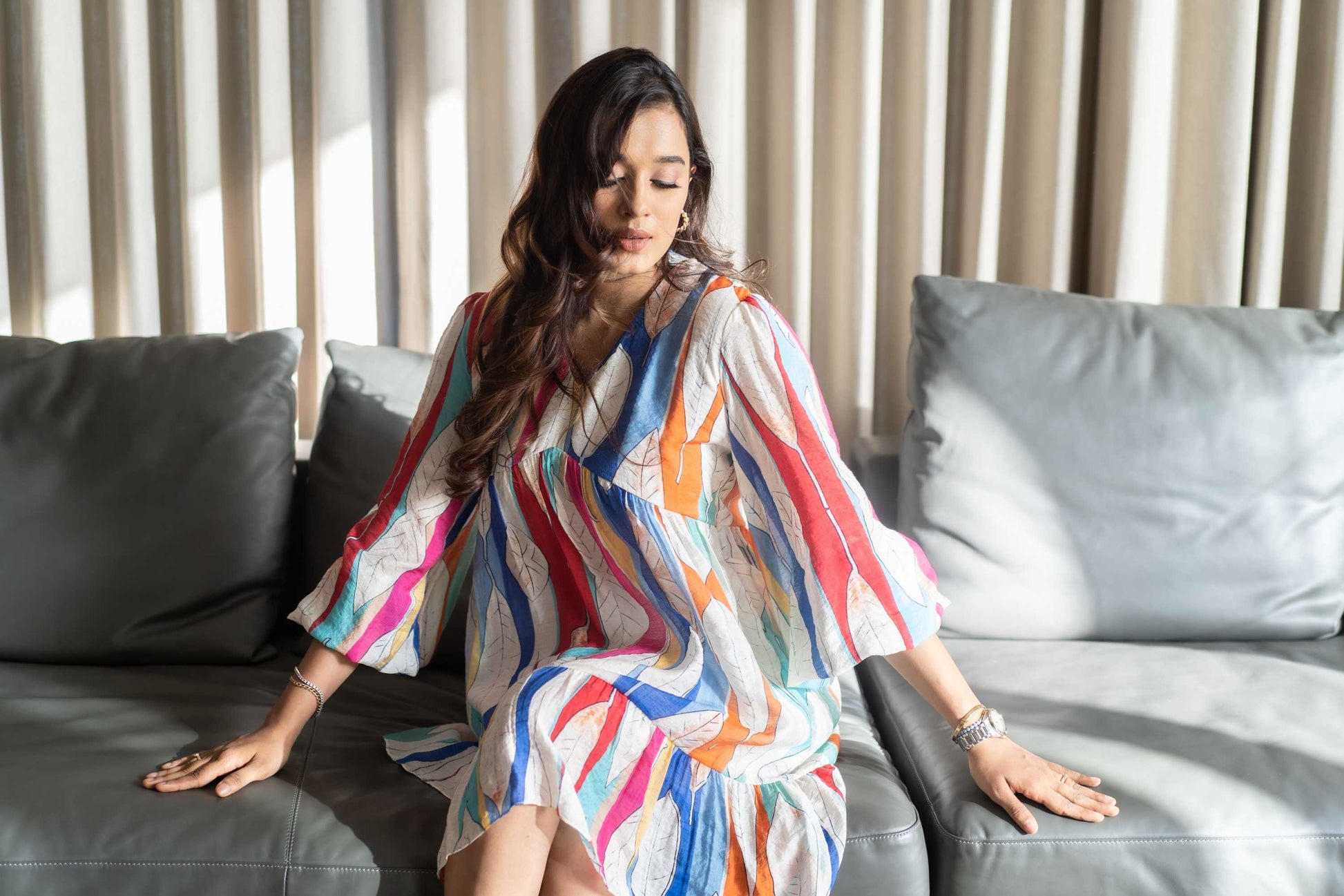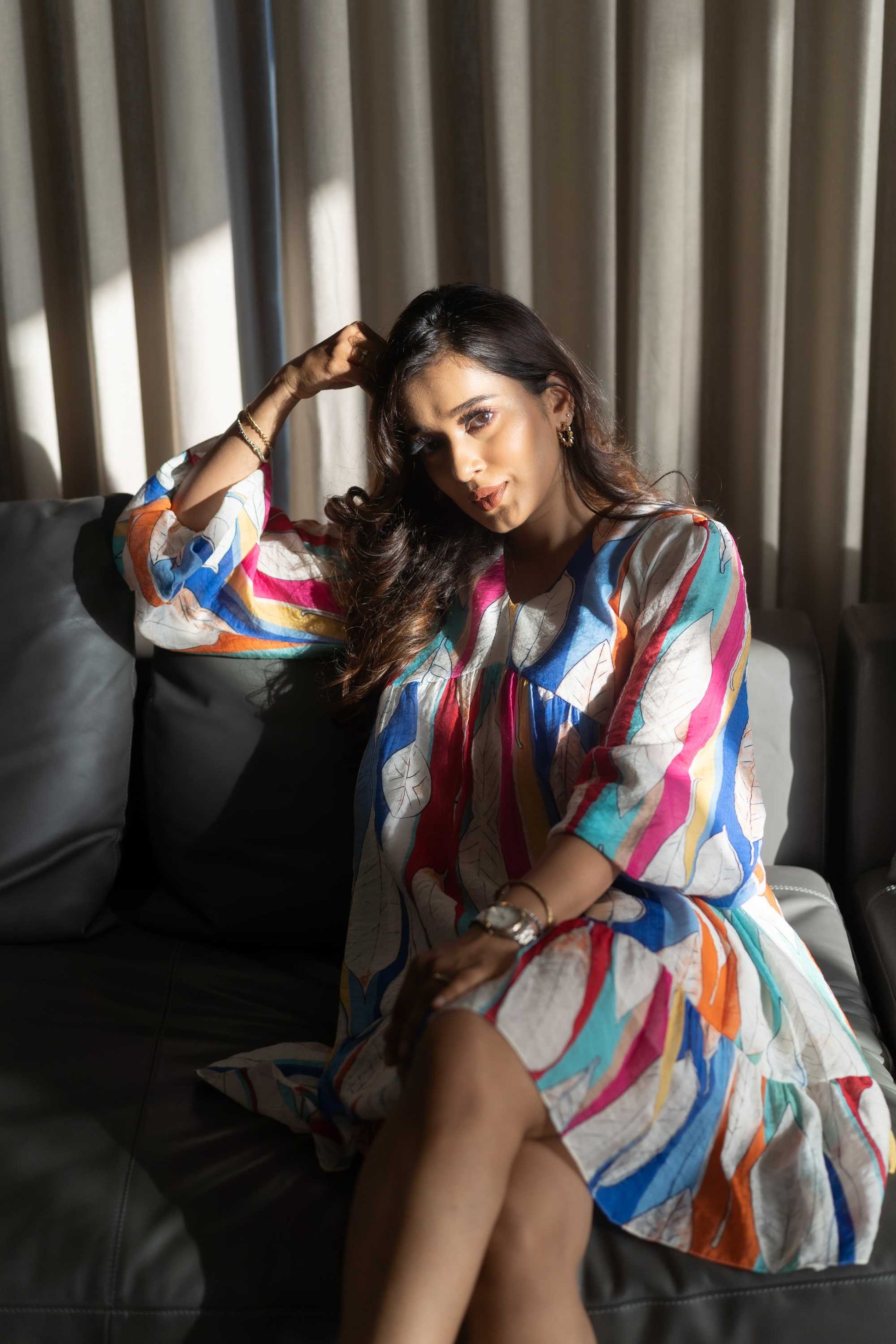 Three tier knee length dress with all the pop you need. Three tier dress with all the pop you need. The dress is crafted in a blend of silk and cotton, knee length silhouette finished with elasticated long sleeves and pockets.