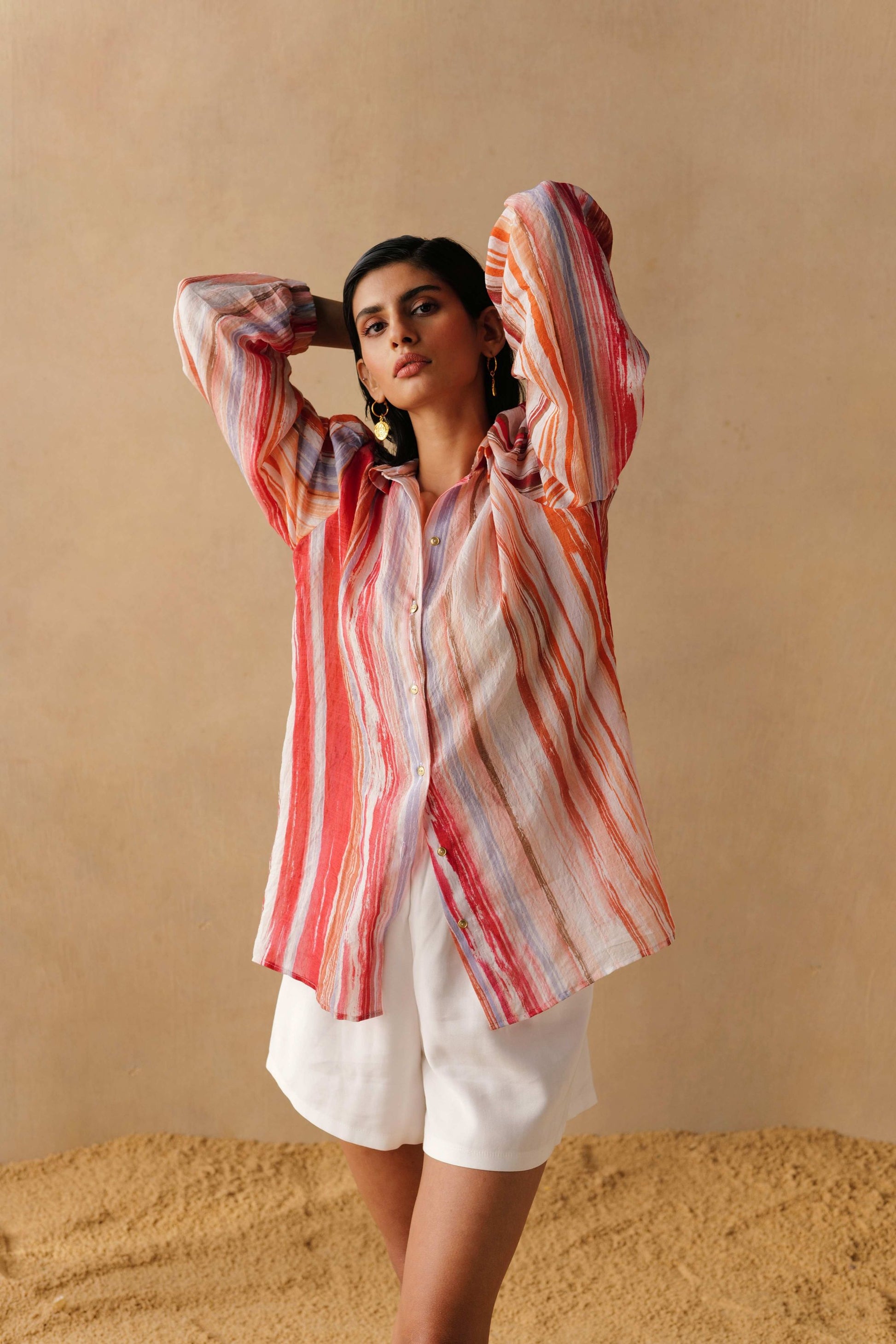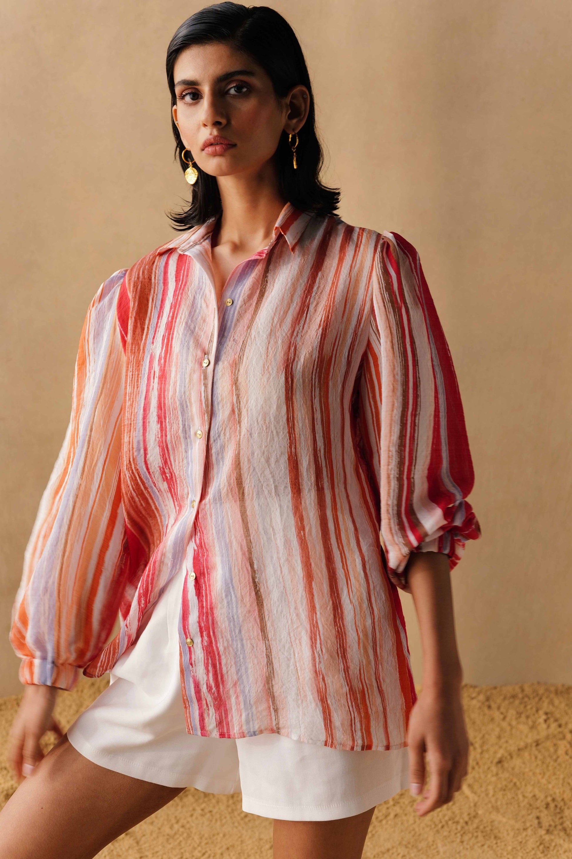 Orange stripe shirt crafted in a blend of lightweight cotton and silk is enriched with gathered elasticated sleeves and flat Golden Buttons. It's easy to pair up with every other bottom in your closet.