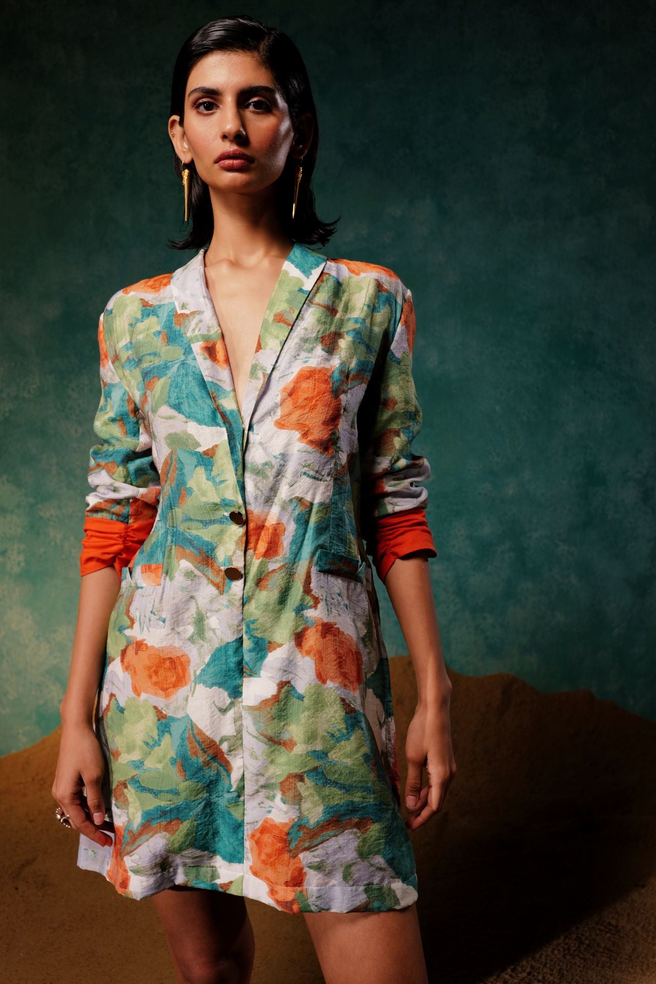 our stylish "MINT" blazer dress, a versatile piece that exudes elegance. This dress features three-quarter sleeves with ruched orange cuffs, adding a pop of color and a touch of sophistication. With convenient side pockets and show pockets in the front, this dress combines practicality with style. The elastic at the back ensures a comfortable and flattering fit. Step out in confidence and embrace the chic appeal of the "MINT" blazer dress, perfect for making a fashion-forward statement.