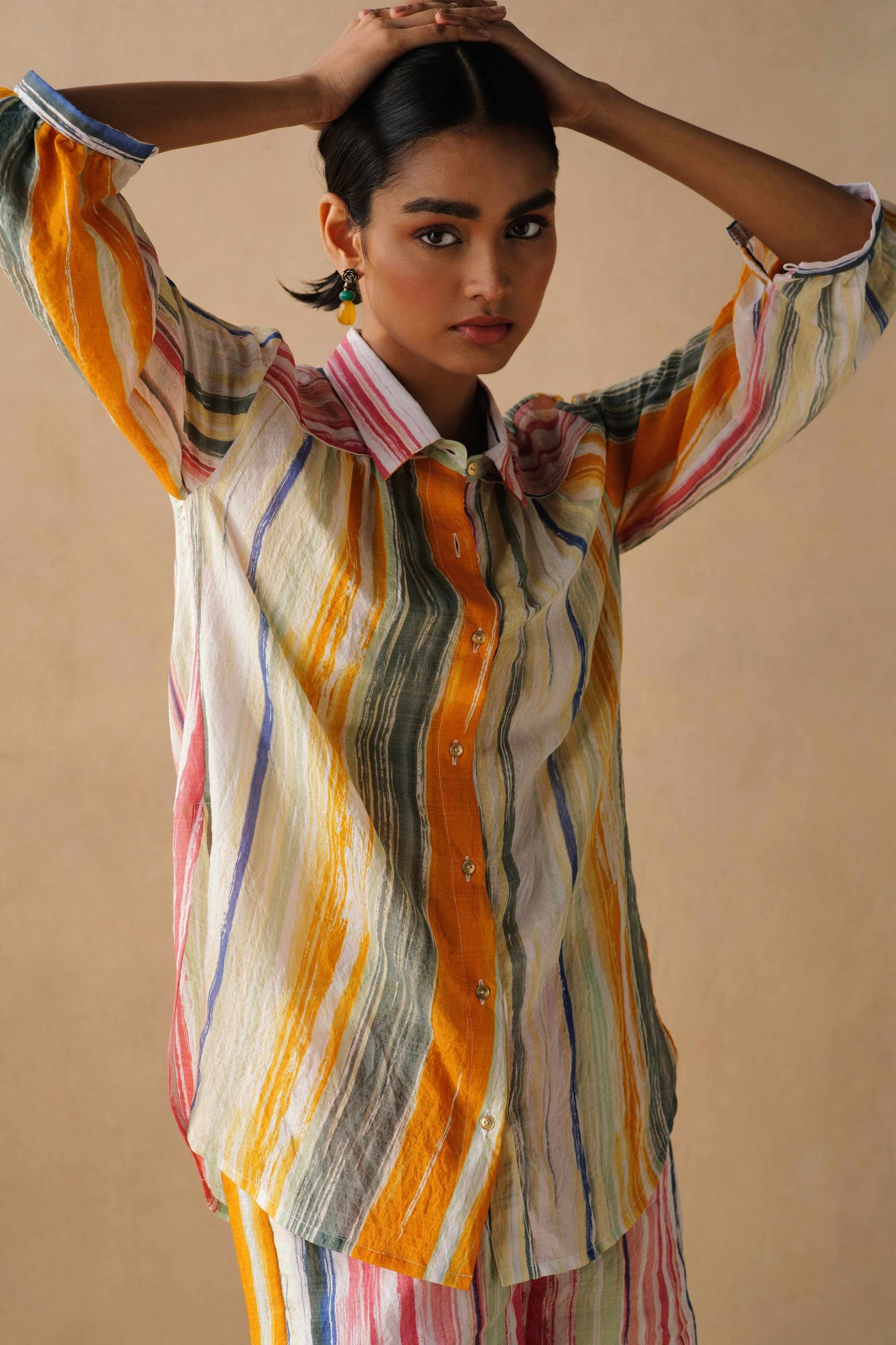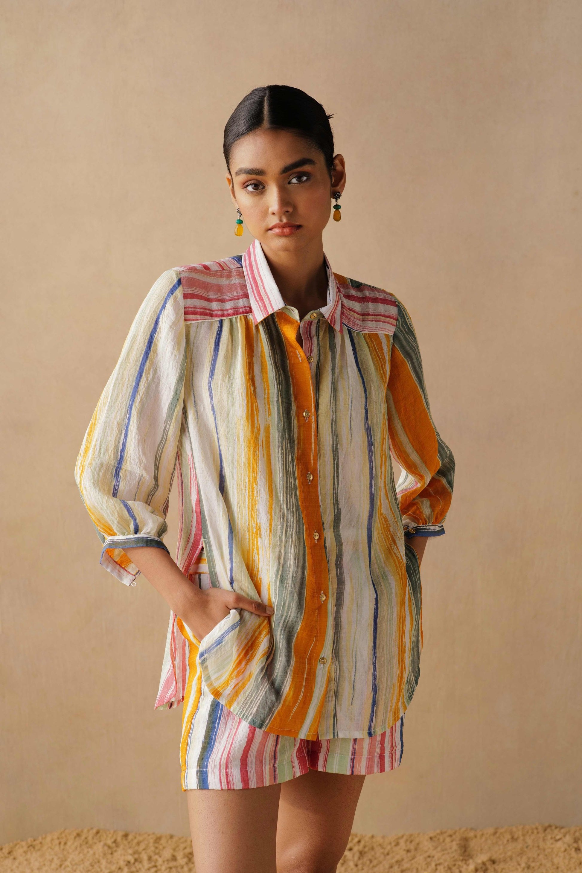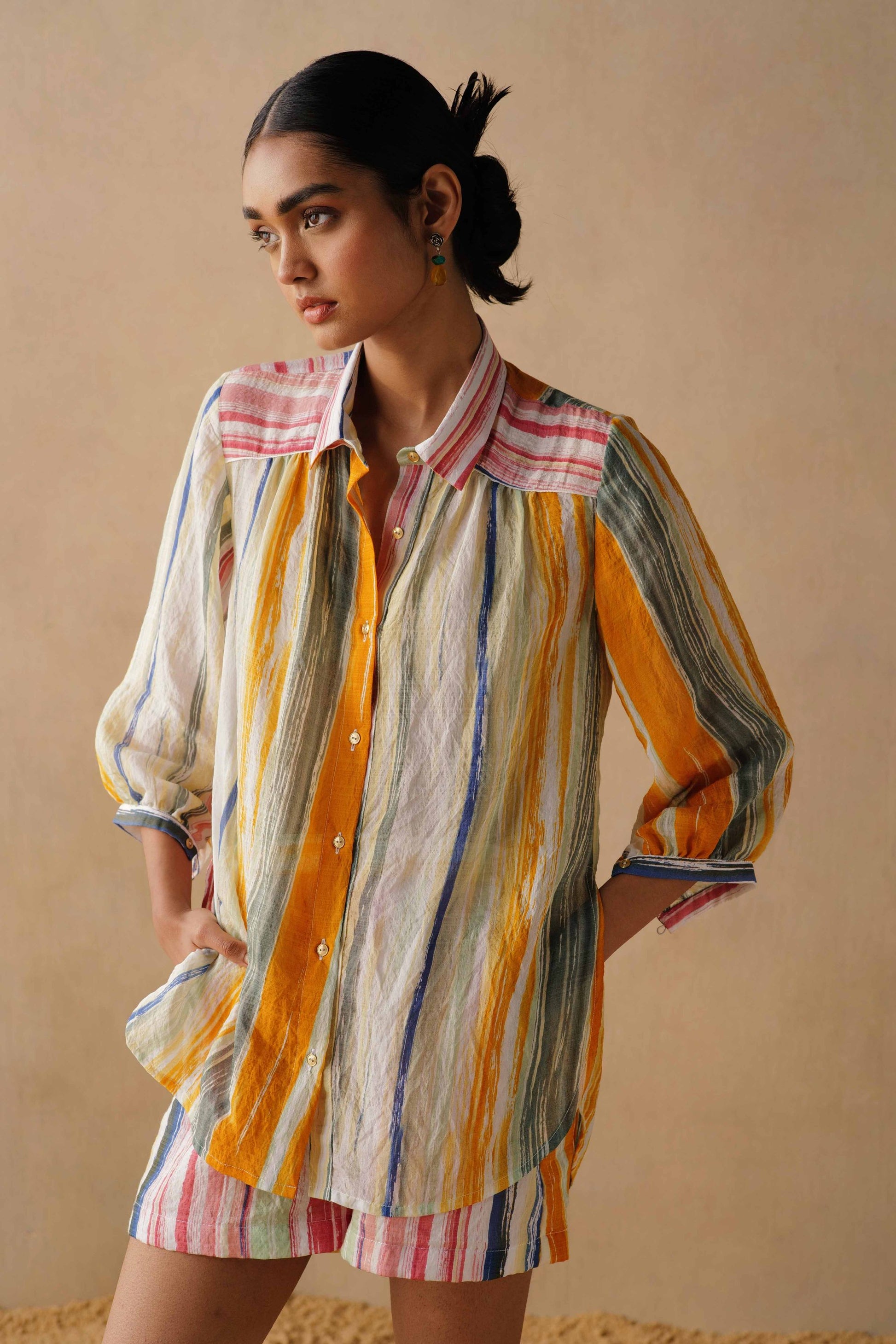 Multicolored stripe shirt with Gather sleeves and pocket shorts.