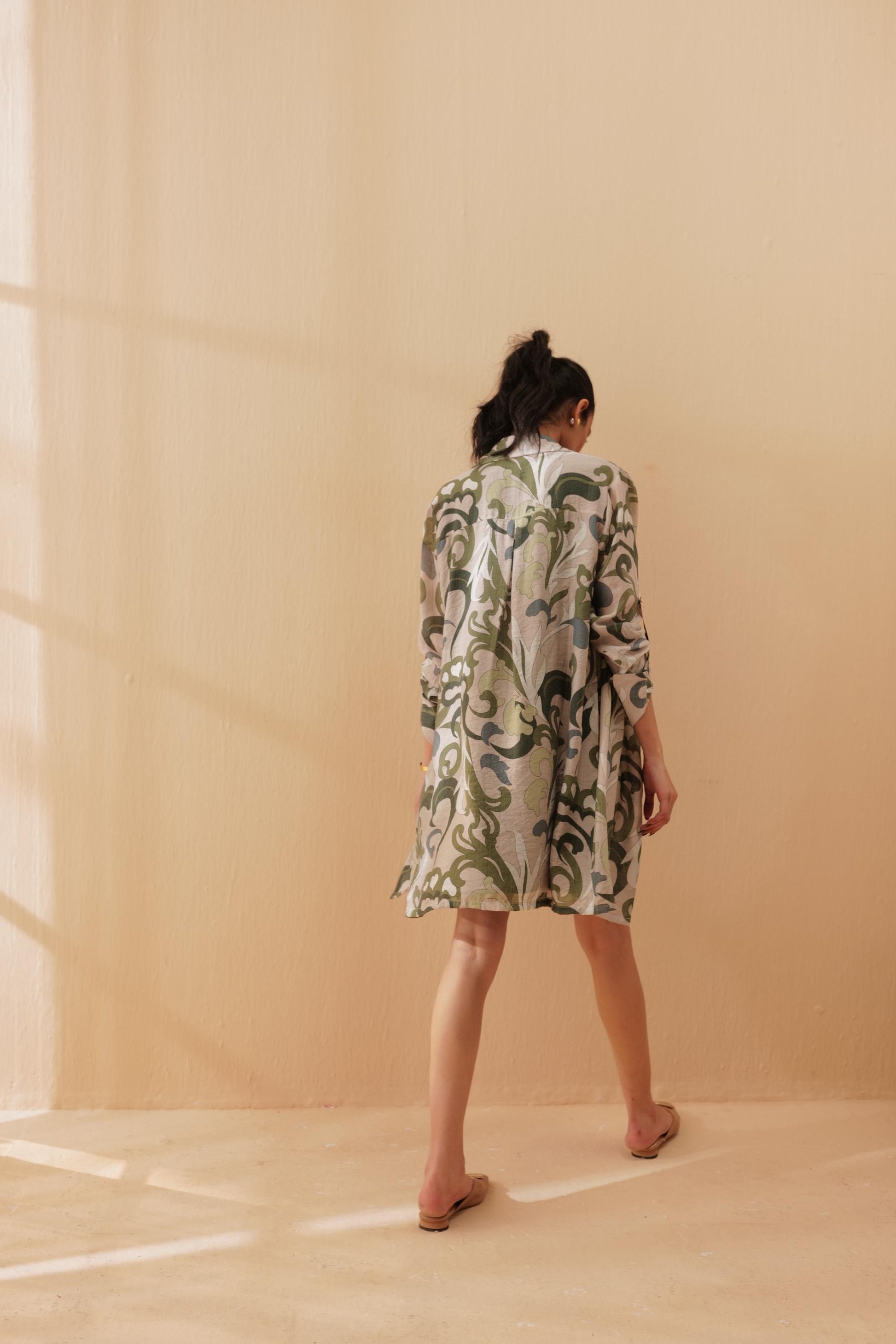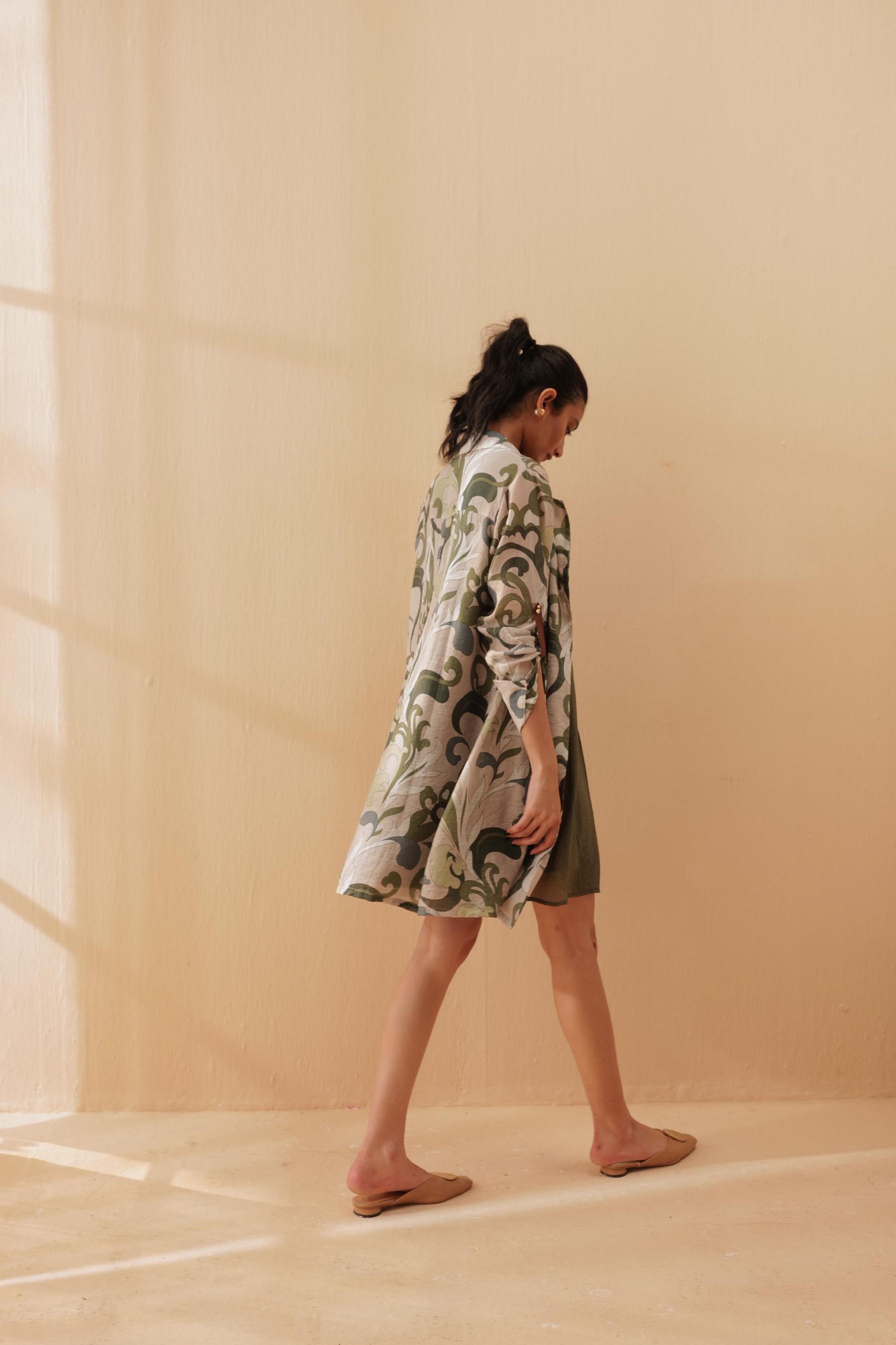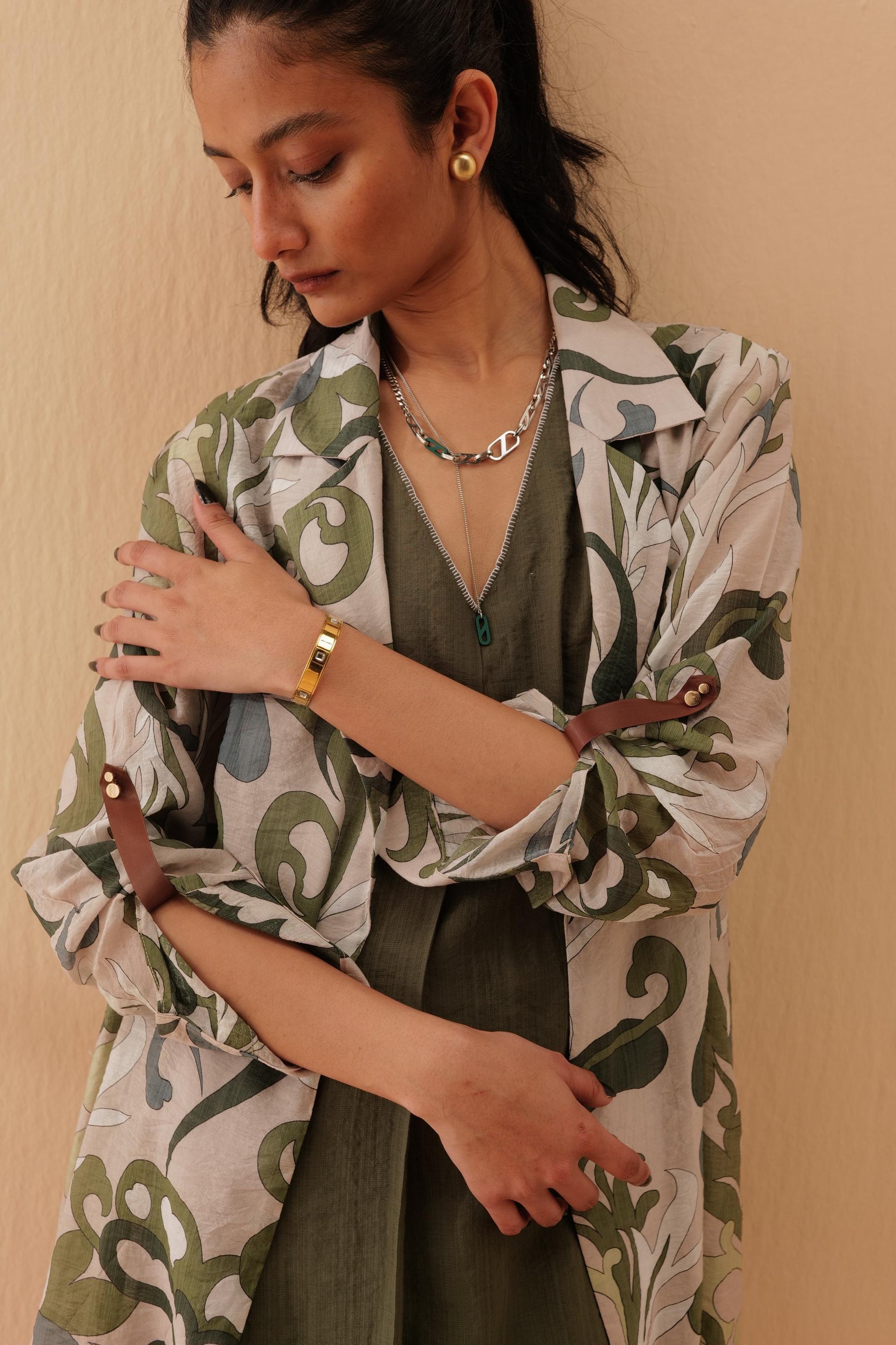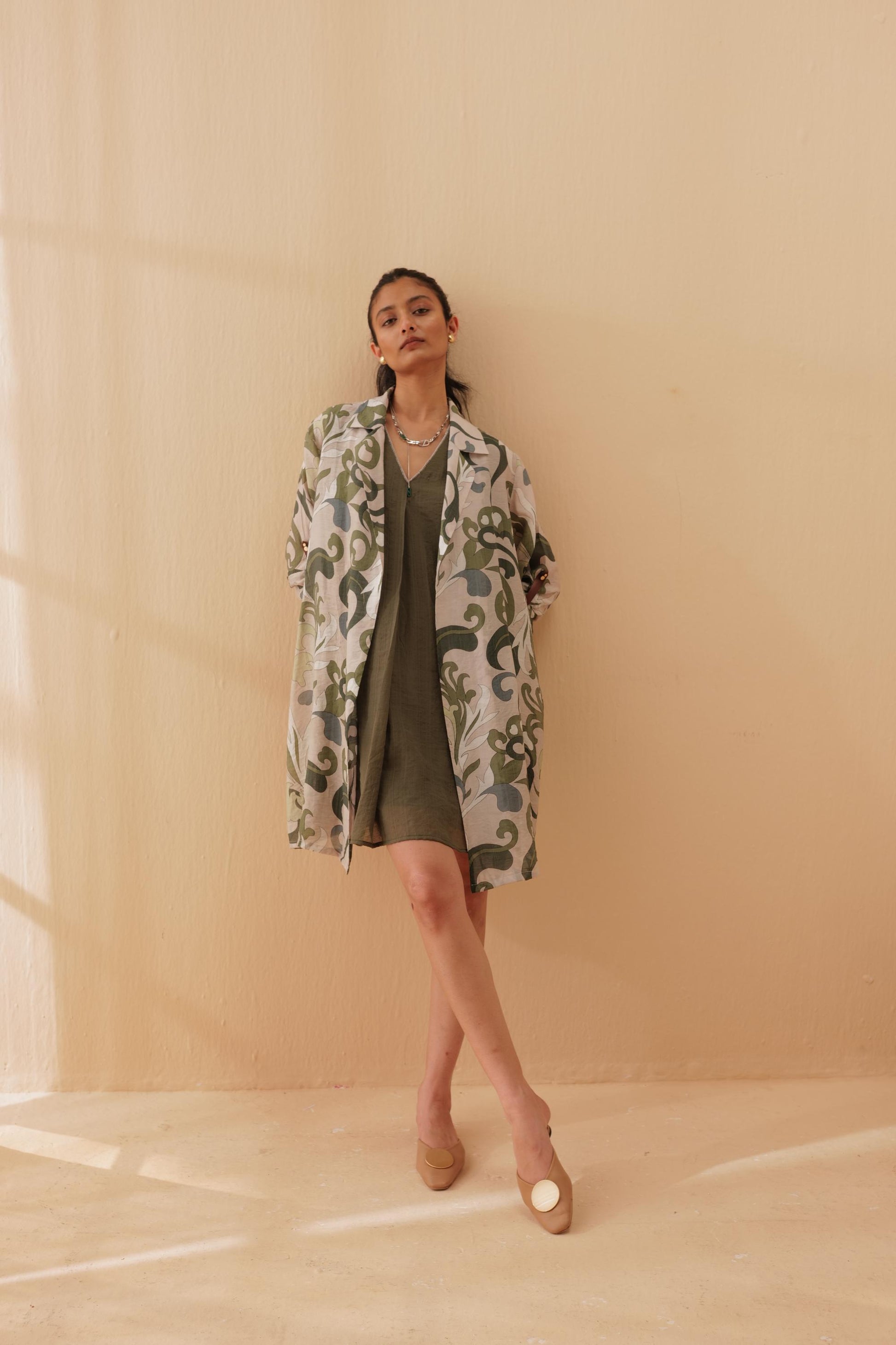 Olivia print full sleeves lapel jacket with box pleate in back paired with olive green V neck dress with pleate and threadwork detailing has pockets .