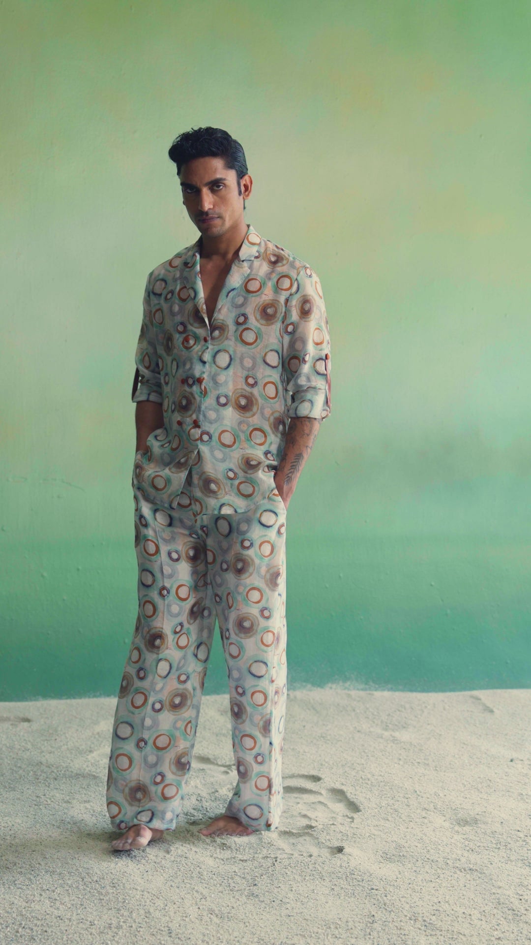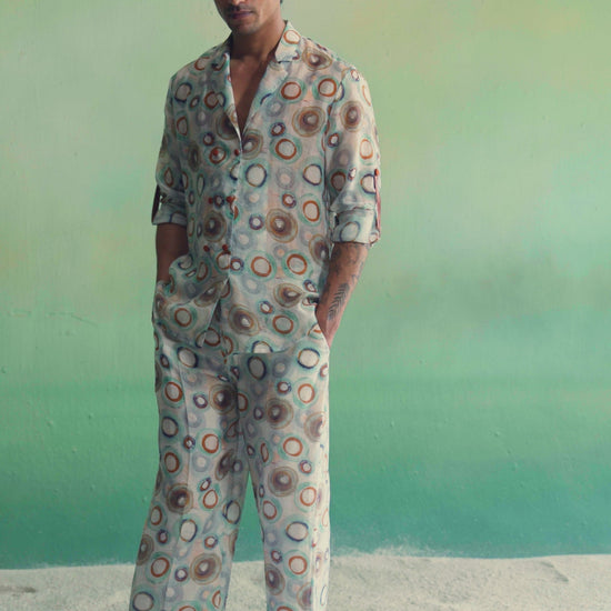 These printed pants are crafted from lightweight, breathable fabric and feature an all-over abstract circular motif that brings a soft, artistic charm to everyday dressing; designed with a relaxed, easy silhouette, they offer all-day comfort while maintaining a clean, fluid drape, making them perfect for warm-weather wear—style them with the matching shirt for a coordinated statement or pair with a solid top for an effortlessly refined look.