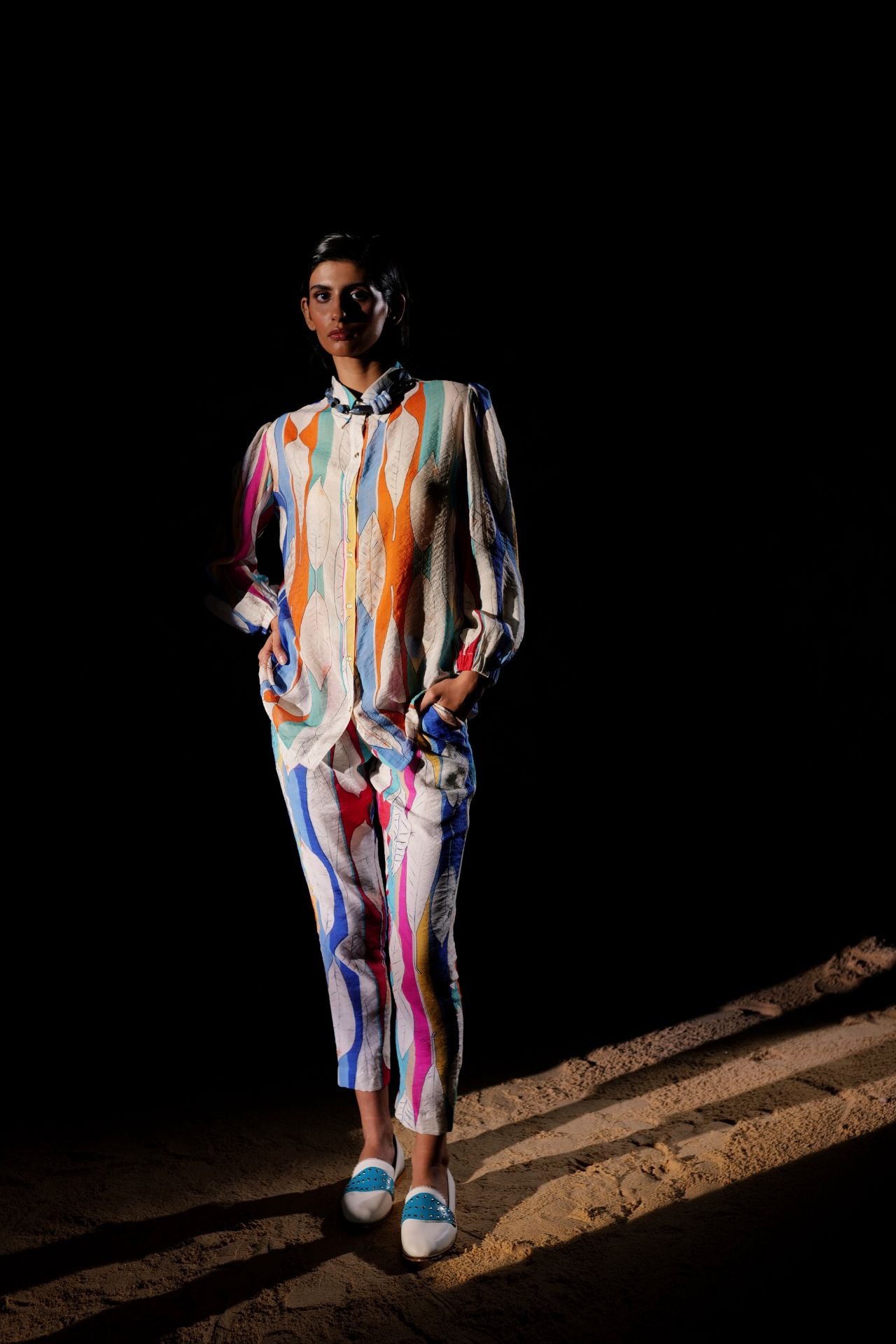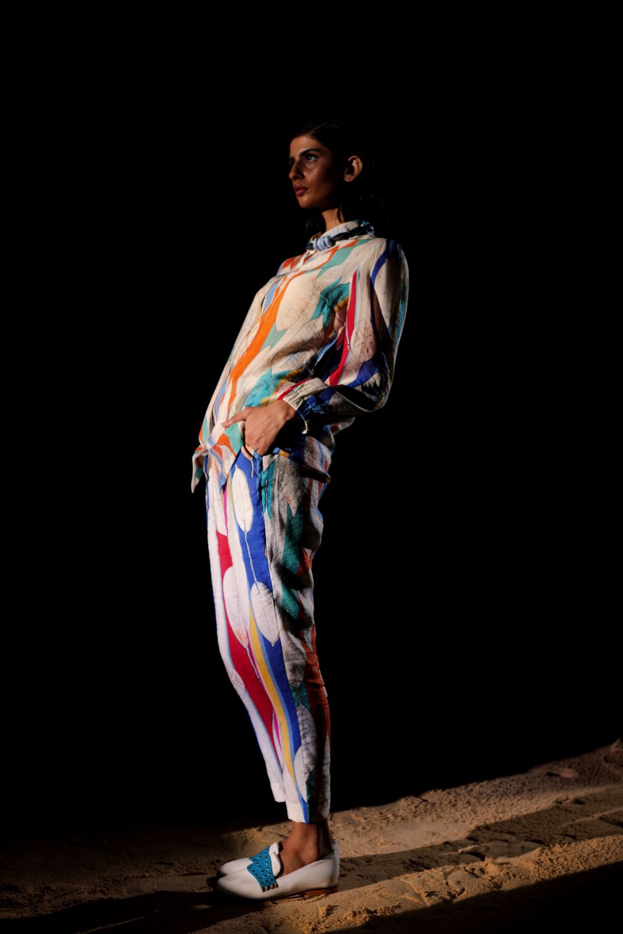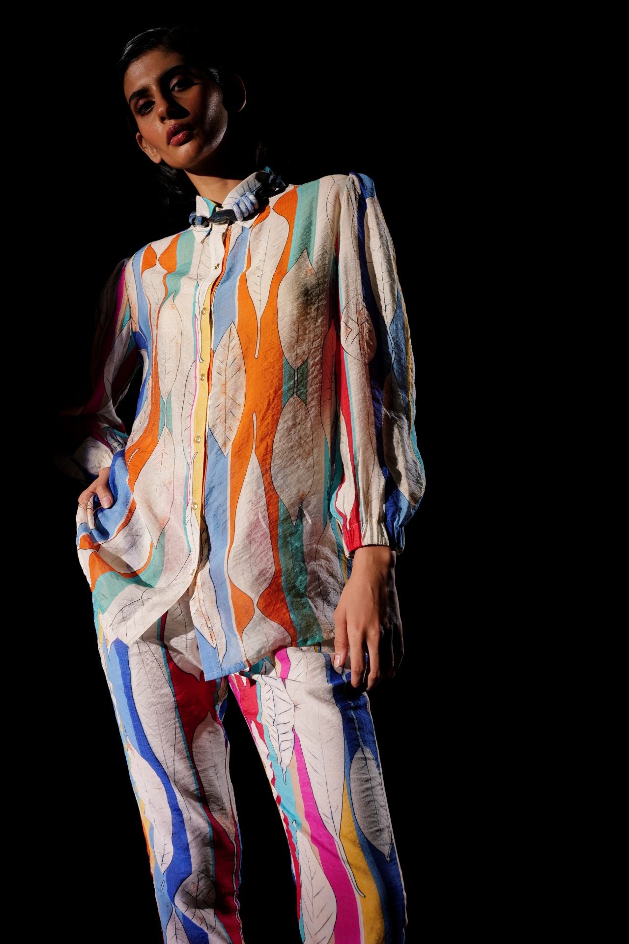 Our mesmerizing "Prism" co-ord set, a harmonious fusion of relaxed fit and transcendent colorway. Inspired by the vibrant elements of a prism, this set showcases an artistic blend of style and creativity. The top has long gathered sleeves, adding a touch of elegance and movement to the ensemble. Paired effortlessly with coordinating pants, this co-ord set is designed to make a statement. Embrace the captivating allure of the "Prism" co-ord set and immerse yourself in a world of artistic expression and fashion-forward flair.