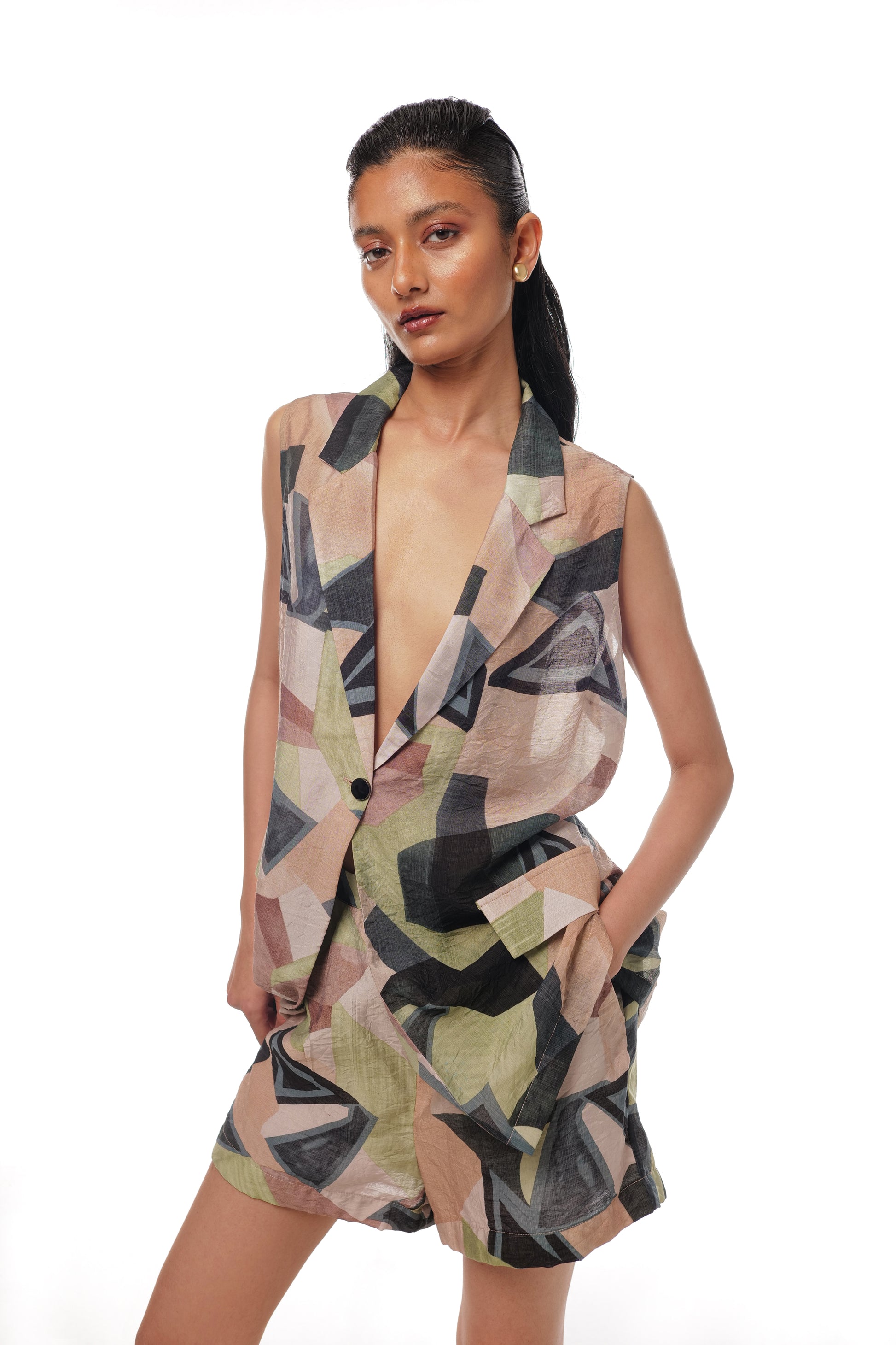 Introducing the Rio Print Blazer and Shorts Set, a geometric-inspired ensemble that redefines contemporary fashion. The sleeveless blazer features a striking geometric print, perfectly complemented by a distinctive brown loop at the back center joint. The matching shorts echo the same bold print, creating a cohesive look. Ideal for making a stylish statement, the Rio Print Blazer and Shorts Set effortlessly combines modern design making it perfect for any trendsetter's wardrobe.