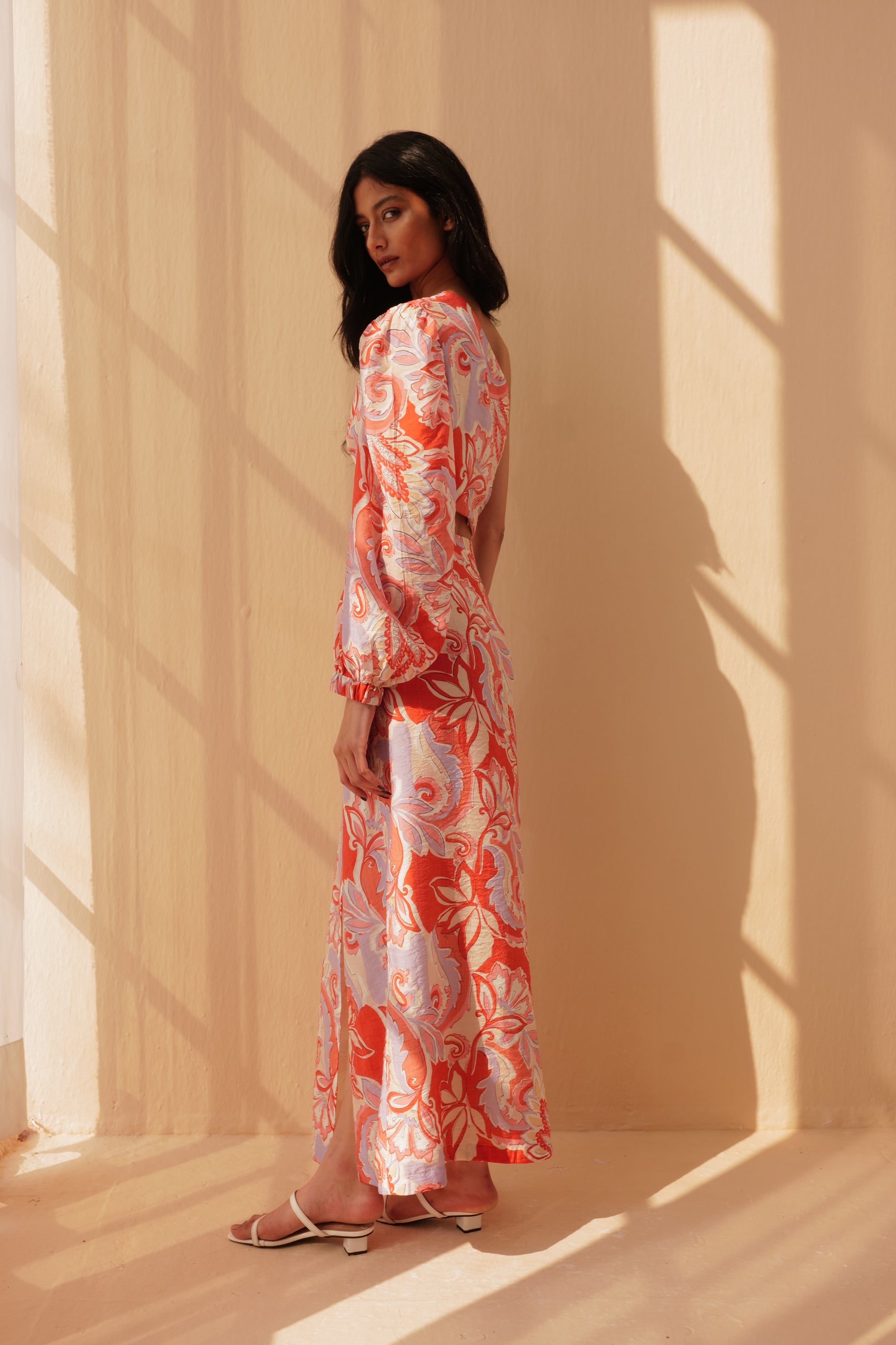 One shoulder tropical ruby print top made of cotton and silk blend making it perfect for your summery day out, with elasticated full sleeves paired with ankle length slit skirt with drape with golden buckle.