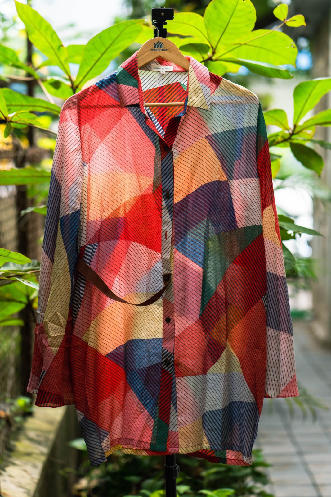 Turn heads with this vibrant Shirt Dress, featuring a bold mix of geometric patterns in rich shades of red, blue, yellow, and green. Crafted from a lightweight cotton blend, it offers a relaxed, comfortable fit with a classic button-down front and soft collar. Perfect for effortless styling, this versatile piece can be worn as a dress or layered as an outer shirt, adding an artistic flair to any look.