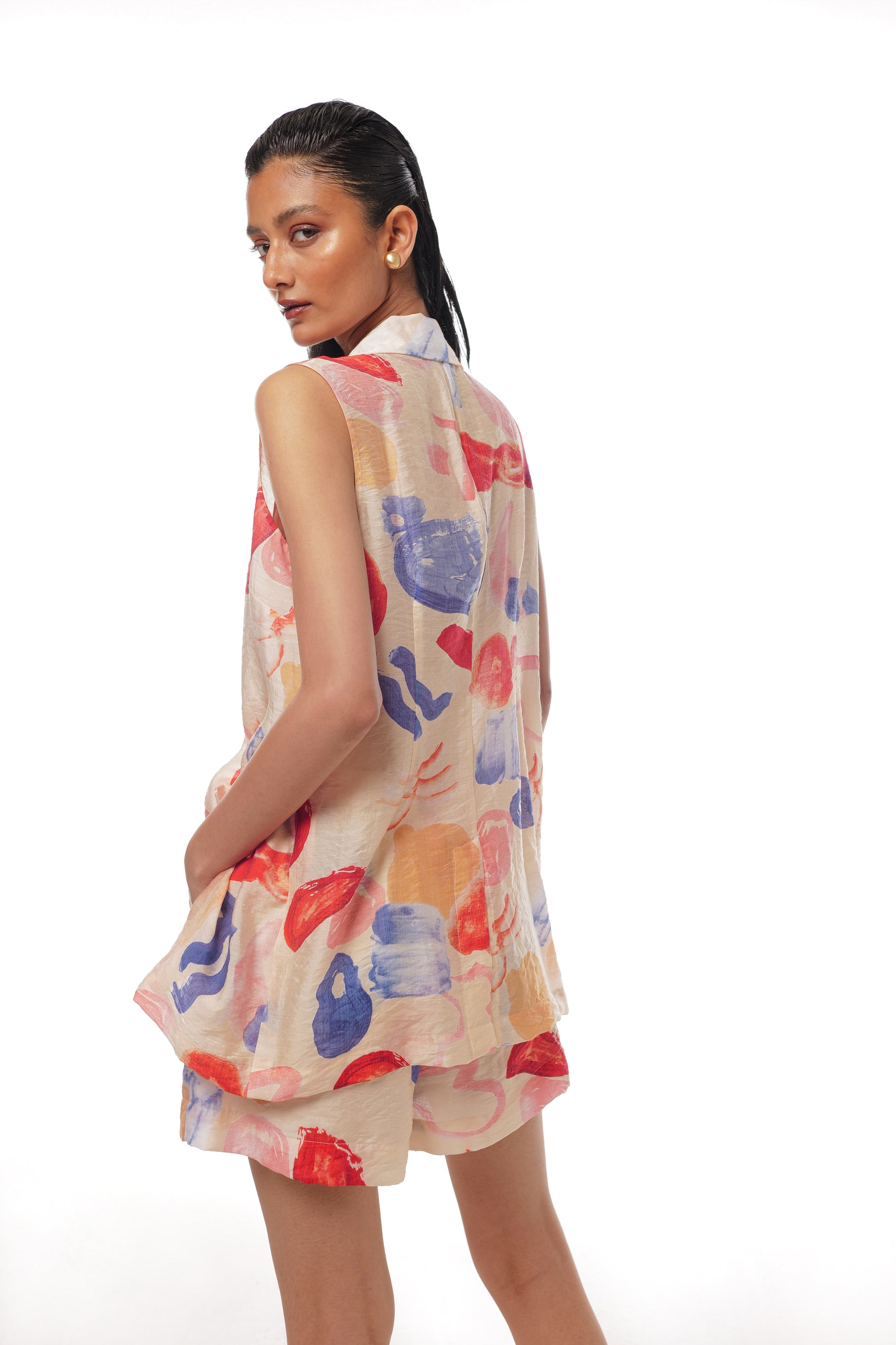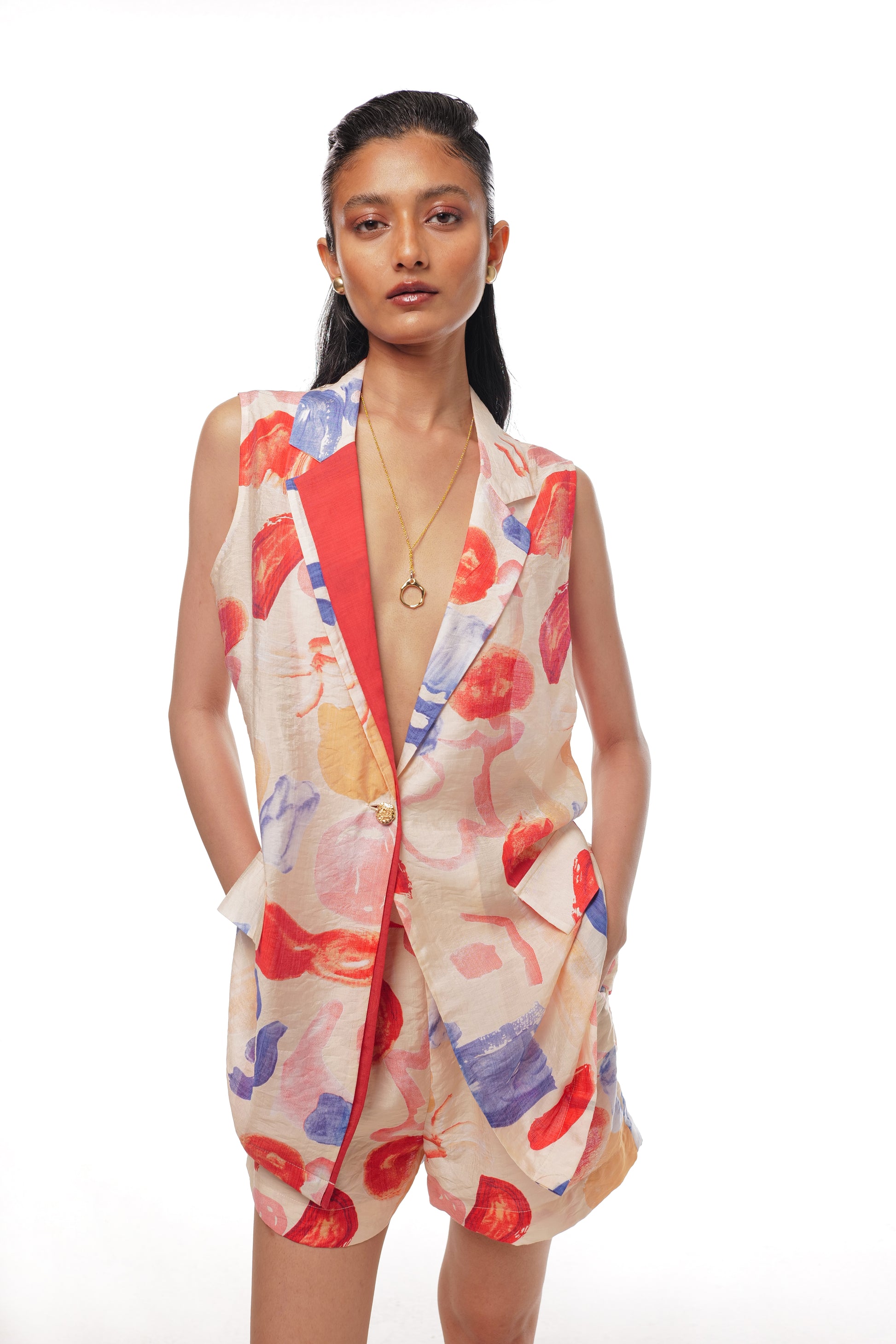 Perfect for warm weather The Sophie blazer features a unique double lapel design on one side, highlighted by a striking plain red lapel that adds a pop of color and a touch of boldness. The matching shorts are designed for comfort and practicality, featuring a convenient zip pocket and an elastic waistband for a perfect fit. Embrace a polished yet playful look with the Sophie set.