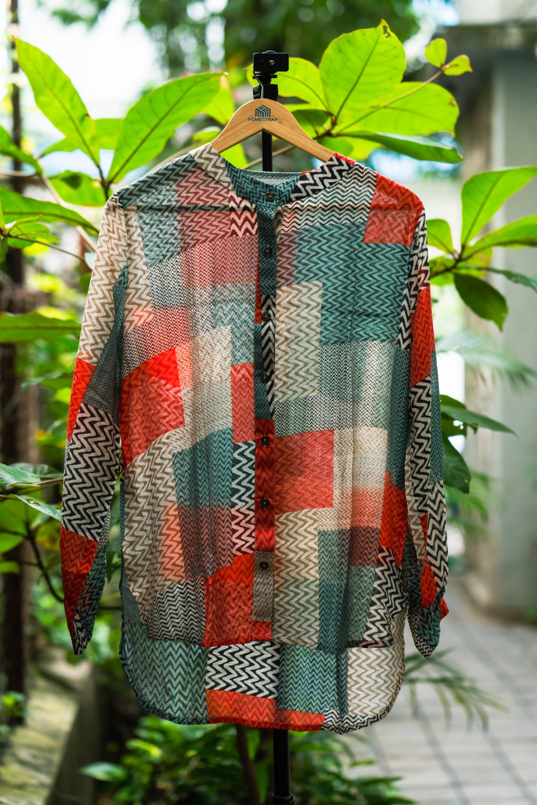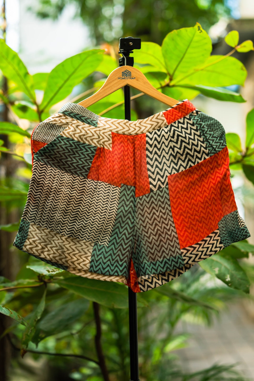 Add a playful twist to your wardrobe with this geometric print co-ord set, featuring a breezy button-down shirt and matching shorts. The bold mix of red, teal, and neutral tones creates a vibrant yet balanced look, perfect for vacations, day outings, or effortless casual chic.