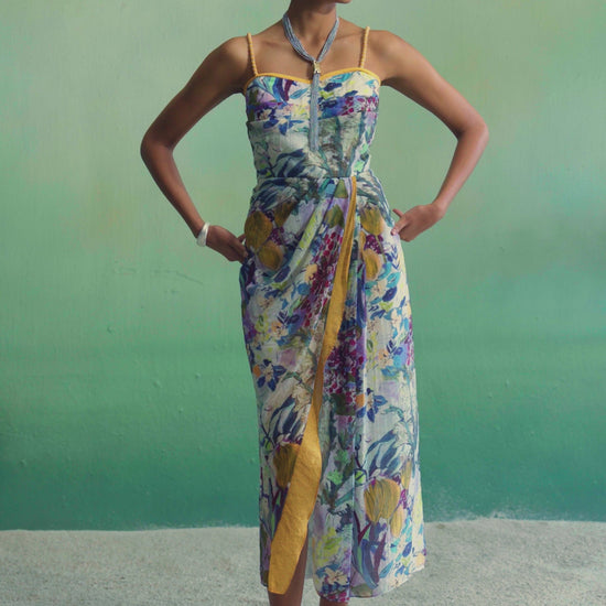 This elegant midi dress is designed to flatter with a softly structured bodice and a fluid silhouette that moves with ease. Featuring delicate straps, a painterly floral print, and a thoughtfully draped front detail that creates a subtle slit, it blends romance with modern refinement. Lightweight and breathable, the dress falls gracefully along the body,