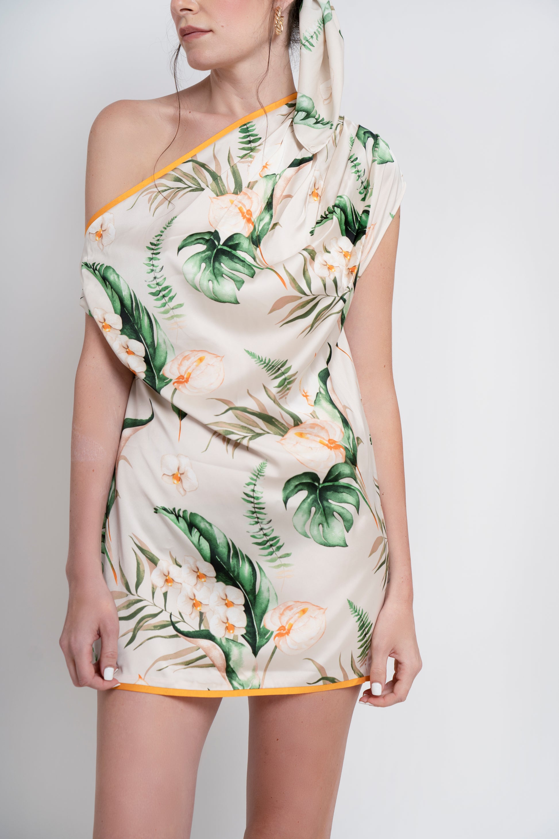 White Tropical Printed drop shoulder dress, with yellow piping as a highlight.