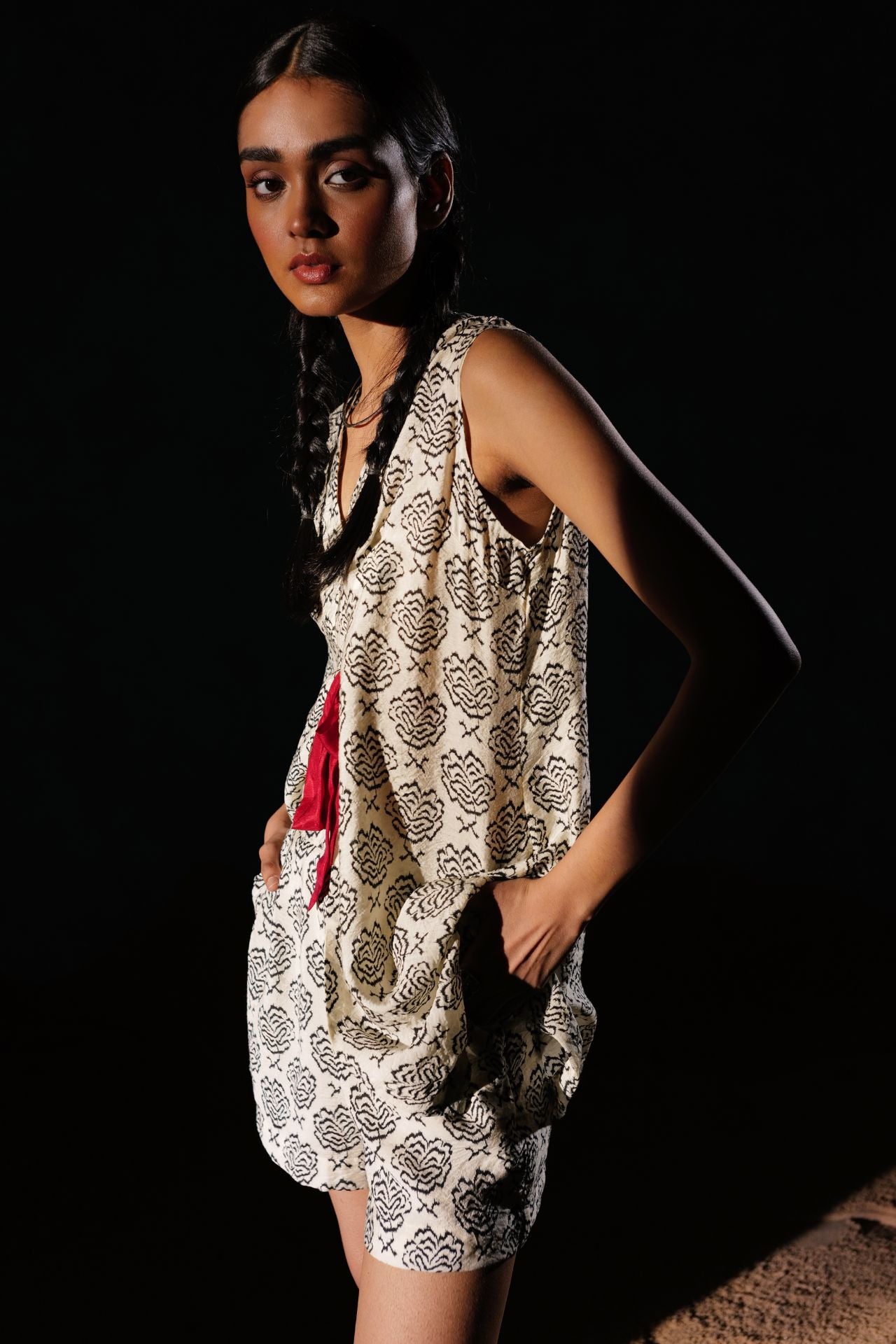 our captivating "Wish Me Roses" co-ord set, designed to make a bold statement. The sleeveless top in this set features a thigh-length cut with a flattering v-neckline and a front hook closure, exuding modern sophistication. Paired with matching shorts, the ensemble creates a sleek and coordinated look. The black and white color scheme is enhanced by a striking red tie element at the front, adding a pop of color and an element of intrigue.